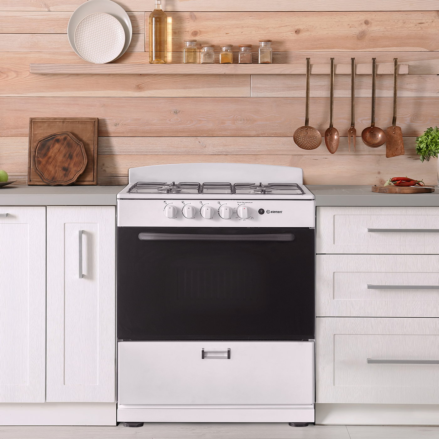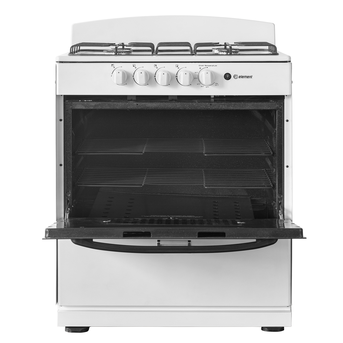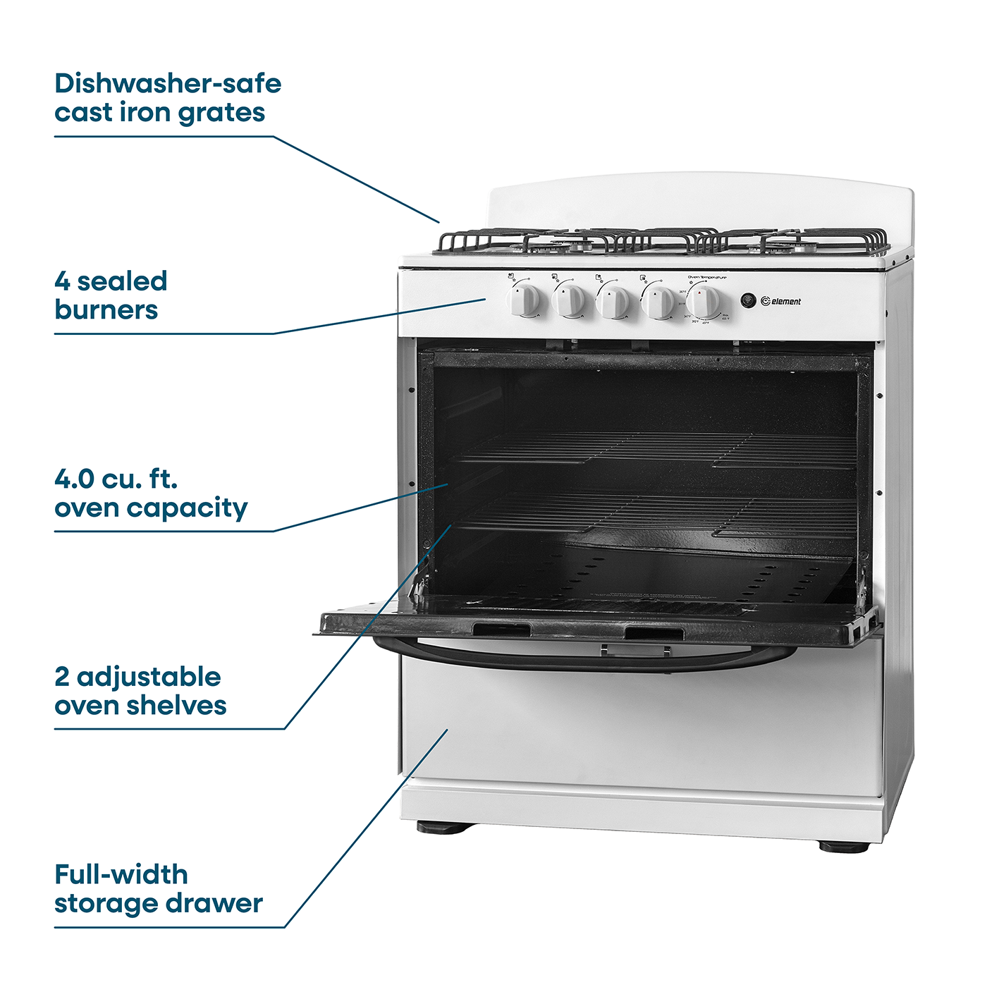 The Element 30” 4-Burner Gas Range stovetop features powerful burners and heavy-duty cast iron grates that make every day cooking a breeze. Two adjustable racks in the spacious 4.0 cubic foot oven help you fit multiple dishes at once, and the lower drawer provides valuable extra storage space. This Element range features easy-to-use front controls, a sleek edge-to-edge glass oven door and a logo-free exterior to seamlessly coordinate with your other appliances.