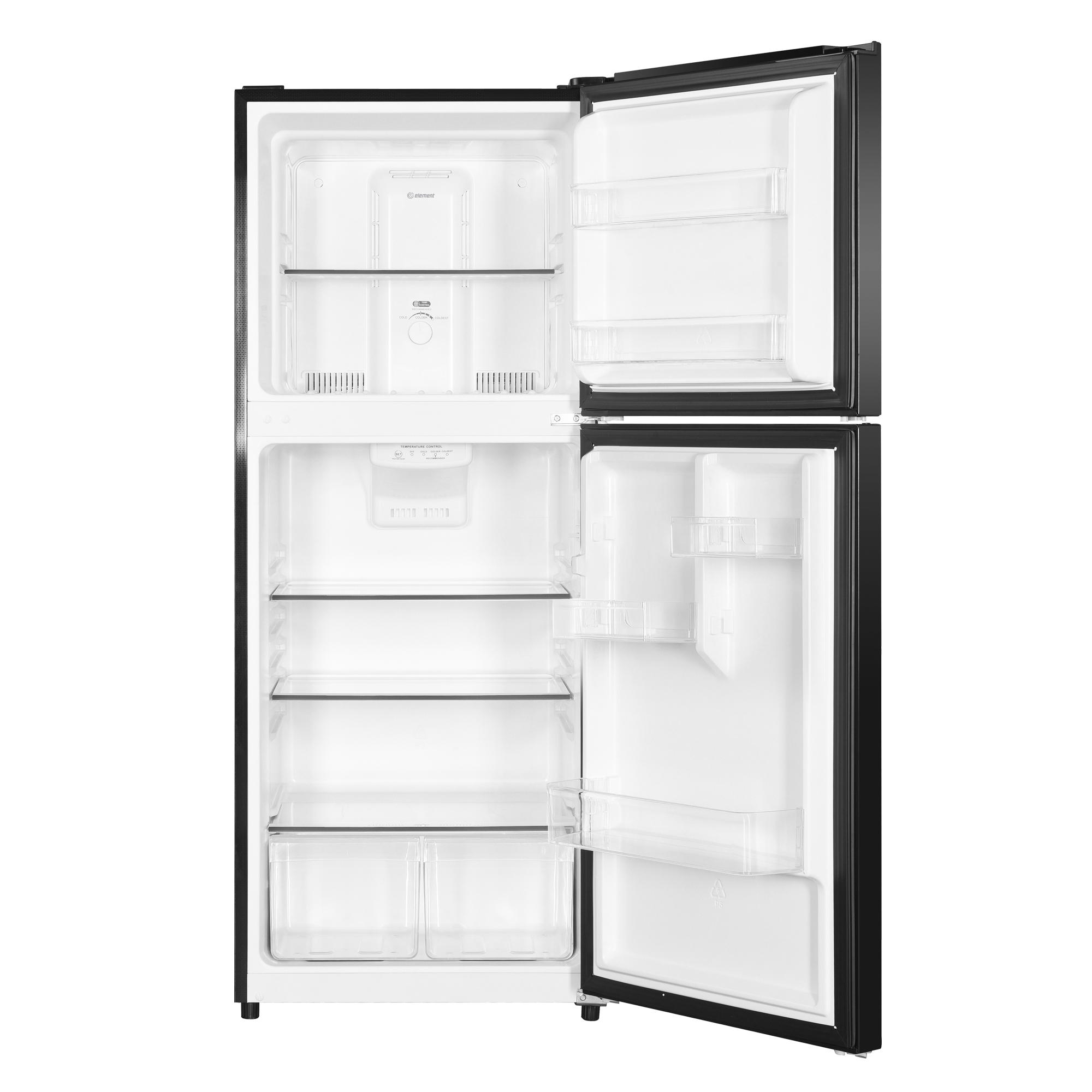 Element’s 10.1 cubic foot Top Freezer Refrigerator is perfect for your apartment, in-law suite, or other small space without sacrificing features. With two full-width adjustable glass shelves, you can customize its storage space to fit large or small containers easily. Plus, additional door storage keeps your drinks handy while freeing up valuable shelf space. One crisper drawer keeps your fruit, vegetables, and leafy greens delicious and ripe. Easily slide the humidity control setting for maximum freshness. LED interior lights emit minimal heat to help you conserve energy while grabbing a late-night snack. Element refrigerators use R600A refrigerant and are ENERGY STAR® certified, lessening energy usage while also being more eco-friendly.The freezer on top features a no-frost system, meaning your food won’t frost over. Plus, door bins give you easy access to your frozen goodies. The door on this refrigerator is reversible to fit your kitchen layout best, and the recessed handle creates a modern look while also saving space. The logo-less exterior and black finish allow it to blend with your current appliances seamlessly. Bring it home.