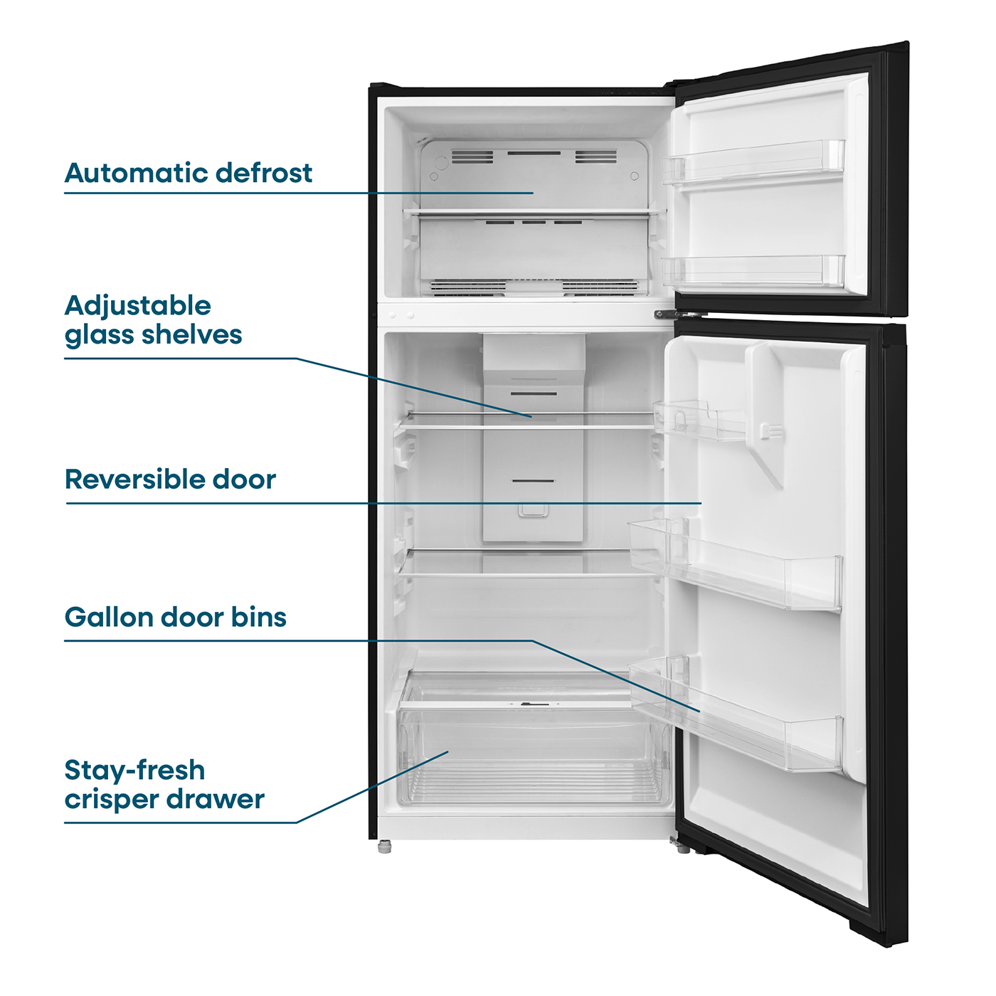 - Three Door Bins - Includes two gallon-size bins for bigger items and are removable for easy cleaning.