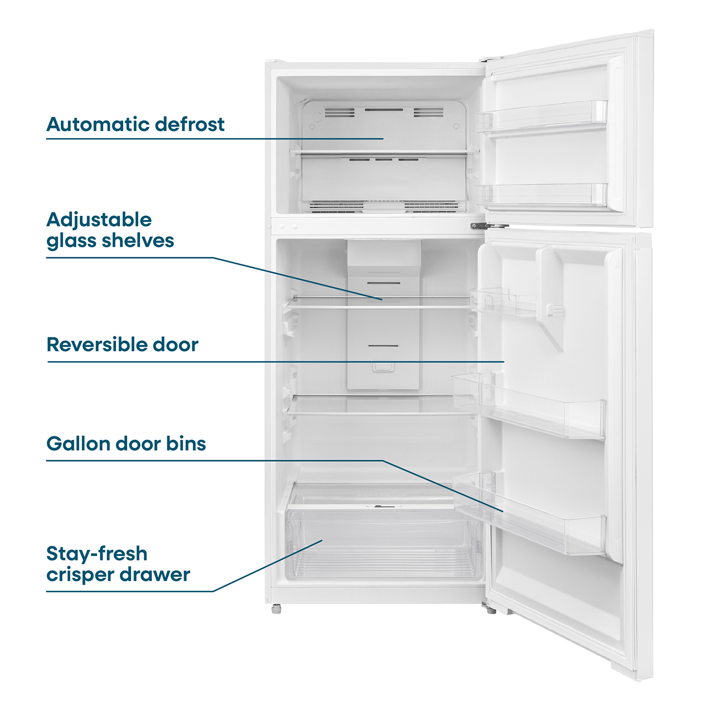 The Element 16.0 Cubic Foot Top Freezer Refrigerator has plenty of storage capacity in a compact foot print that fits your space. The door bins and full-width glass shelves easily adjust for a customized configuration, and the humidity-controlled crisper drawer helps keep your fruits and vegetables fresh and easily accessible. With electric controls and LED lights for energy-conserving visibility, this ENERGY STAR certified refrigerator is eco-friendly, using less energy to operate. Element refrigerators feature reversible doors, recessed handles and a logo-free exterior to seamlessly coordinate with your other appliances for a clean, modern look in your kitchen.