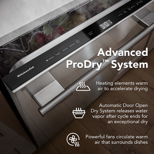 - opens door 4" after the dry cycle ends to release water vapor and provide natural ventilation for an exceptional dry. Use the Automatic Door Open Dry System alone for our most energy-efficient dry* or pair with ProDry™ option for improved drying performance. *Compared to KitchenAid® Dishwashers when using ProDry™ Option.
