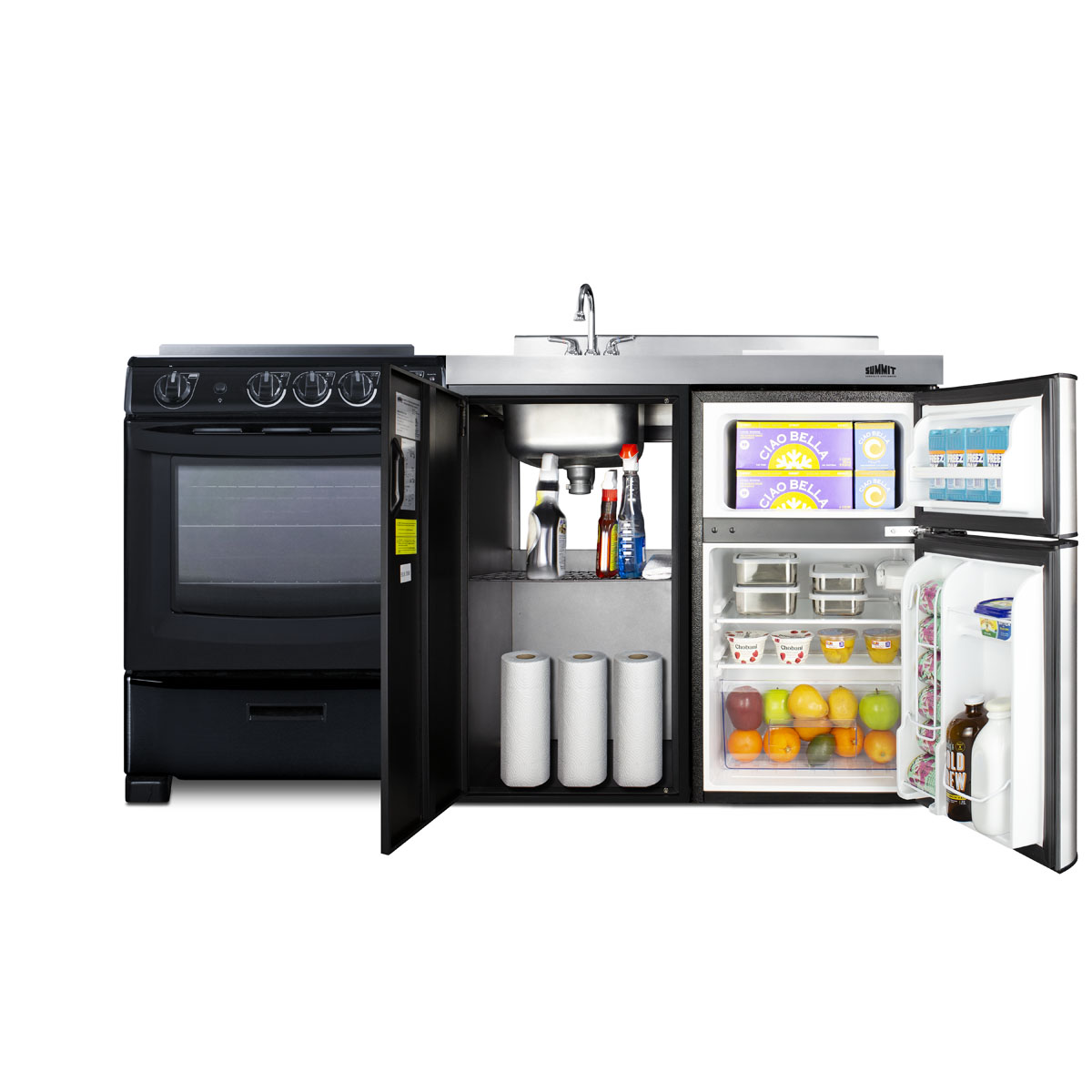 Summit's line of all-in-one combination kitchenettes brings complete kitchen convenience in a slim-fitting design. These units come fully featured with everything you need for the home foodservice experience, including a refrigerator with a freezer compartment, 4-burner smooth top range with oven, sink with faucet, cutlery bin with a removable cutting board cover, and storage cabinet for dry goods. The ACK63ELSTB is a 63" wide kitchenette with an easy-fitting 24" depth and jet black finish. This unit comes with a stainless steel countertop offering durability in a professional look. The surface includes a small cutlery bin, with a removable cutting board cover to ensure easy food prep. The compact sink features a ready-to-use faucet. Underneath the sink is a large cabinet with a removable shelf for added storage convenience.Unlike many other brands' kitchenettes, all Summit units include a refrigerator with a freezer compartment to cover all of your cold storage needs. The ACK63ELSTB includes the two-door, ENERGY STAR certified CP34BSS, with 3.2 cu.ft. of storage space. A dual evaporator system separately cools the auto defrost refrigerator section and manual defrost freezer compartment for improved overall performance. This model also includes an adjustable glass shelf, door storage, and a crisper. The ACK63ELSTB also ships with Summit REX2431BRT, a 24" wide 220V electric range complete with a smooth-top 4-element cooking surface and a full oven compartment with a bake and broil function. This range includes a large window with interior oven light, adjustable slide-out oven racks, hot surface indicator lights for added safety. The range can be installed on the left or right side of the kitchenette.The ACK63ELSTB is shipped on one pallet, with the kitchenette and refrigerator fully assembled and the range packaged separately. Perfect for studio apartments, hotel rooms, dormitories, assisted living facilities, temporary kitchen facilities, and any other location in n