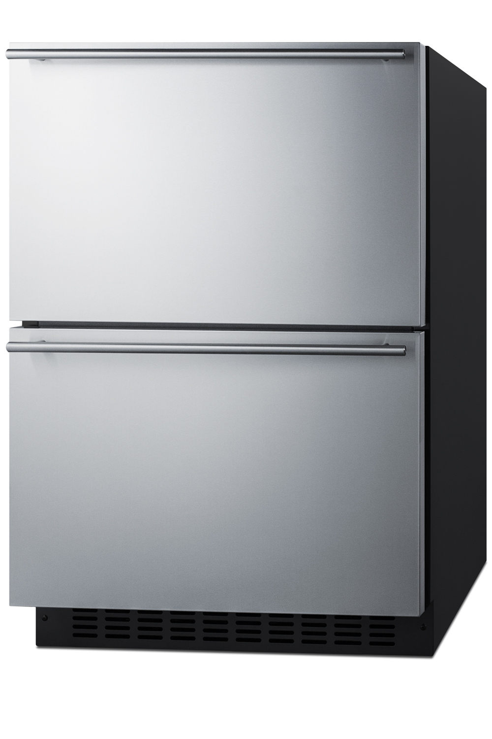 Summit manufactures an extensive selection of drawer refrigeration designed to bring elegant style and modern convenience to any undercounter space, with ADA compliant choices designed for indoor and outdoor installation. Sized at just under 24" wide and 32" high, model ADRF244 is a 2-drawer refrigerator-freezer perfectly designed for built-in or freestanding installation in ADA compliant settings with lower counter height. The fully finished black cabinet and stainless steel drawer fronts feature weatherproof construction for safe use in outdoor kitchens, with a sealed back to protect all components from the elements. Sleek horizontally mounted handles complete the stylish look. The drawer fronts can also accept user-provided overlay panels to create a custom look that blends into existing cabinetry designs (panel dimensions: 23.43" W x 14.1" H at 3/4" thick).Inside, the ADRF244 has a generous 3.3 cu.ft. capacity to accommodate your storage needs. Both the top drawer refrigerator and bottom drawer freezer utilize frost-free operation with fan-forced cooling, ensuring an even temperature distribution with minimum user maintenance. A digital thermostat, located atop the refrigerator drawer, makes it easy to manage the temperature, with an LED display that can be read in Celsius or Fahrenheit. Two adjustable, removable dividers allow you to separate the drawer compartments into two (freezer) or four (refrigerator) zones to easily accommodate a variety of sizes. A full-width sliding removable chrome basket offers added storage convenience, while white LED lighting in the refrigerator drawer makes it easy to view stored contents. A child lock will disable the digital controls after two minutes of inactivity to prevent accidental adjustments. Additional features include audible alarms for high-temperature fluctuations and open drawer alerts, a temporary memory function to recover all settings in the event of power loss, and sabbath mode to disable certain electrical feat