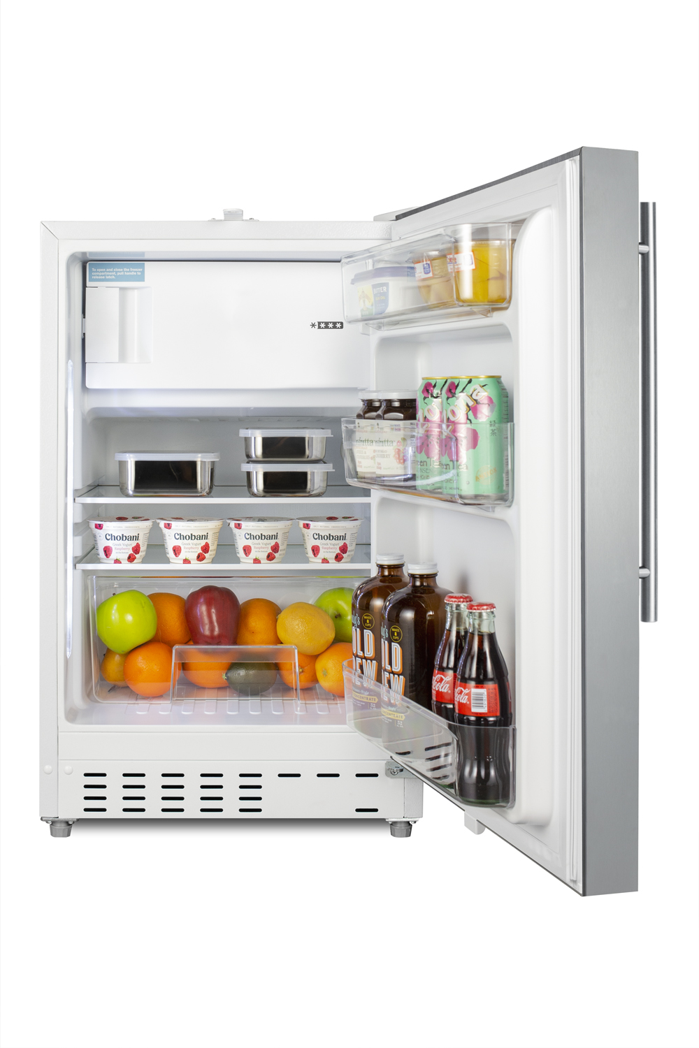 Summit Appliance offers a wide range of built-in undercounter refrigerator-freezers designed for installation under lower ADA compliant counters, with advanced features for user convenience.The ALRF48SSHV is sized at 32" high to fit under lower counters complying with ADA guidelines for accessibility. The fully finished textured white cabinet allows freestanding use, while the front-breathing system means this unit can be built-in with minimum clearance. The stainless steel, user-reversible door is 3" thick for efficient insulation, with a sleek vertical handle with a thin 14mm diameter, a popular style that matches many common cabinet handles. This unit comes with a right angle cord to allow for easier placement without added depth. A factory-installed lock is conveniently located towards the top of the door to provide security as needed. Inside, the ALRF48SSHV features an all-white interior for easy cleaning and viewing of contents. Static manual defrost operation provides efficient cooling inside the 2.68 cu.ft. interior, while the dial thermostat makes temperature management simple. An automatic LED light located toward the front of the unit attractively illuminates the interior when the door opens. Three spill-proof adjustable glass shelves offer flexible storage options for large and small items, while a pull-out crisper drawer provides storage for fruits and vegetables. Three removable door racks accommodate additional storage as needed. This unit includes a compact freezer compartment with a cover. With its compact size and convenient features, the ALRF48SSHV is the perfect unit for offices, dormitories, and other residential settings in need of an easy-fitting refrigerator-freezer.