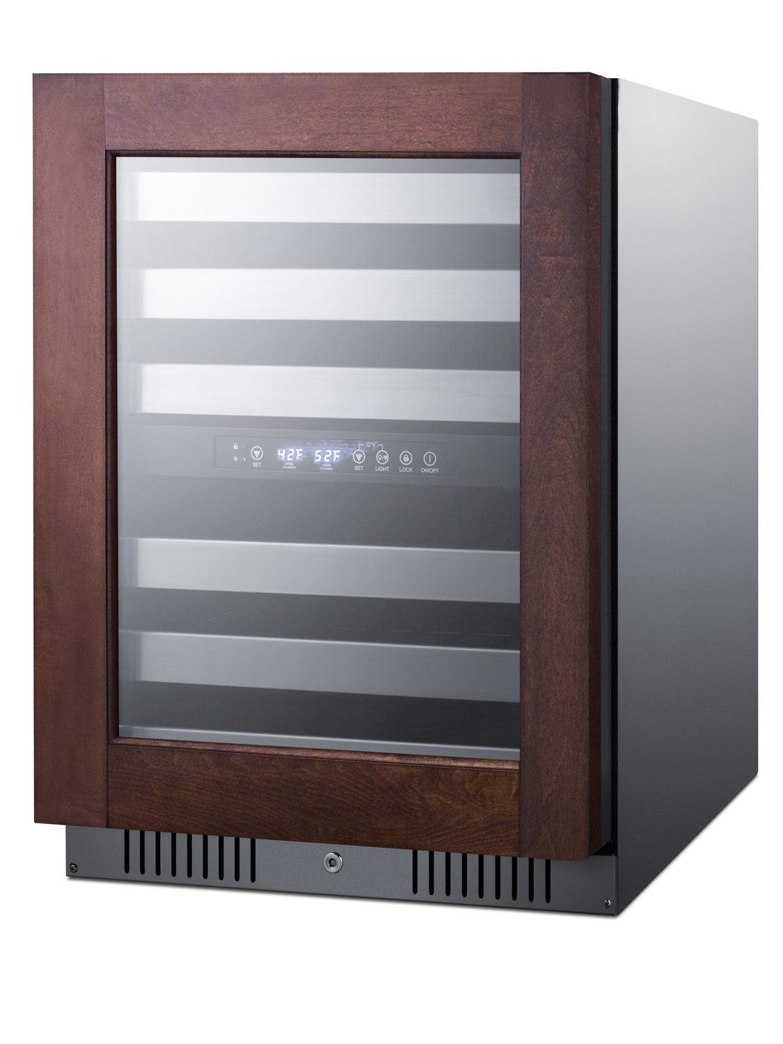 Summit's extensive selection of built-in undercounter wine cellars includes commercially approved ADA compliant choices that let you achieve a custom look ideal for any space.The ALWC532PNRLHD is a dual zone wine cellar sized for 24 inch spaces. The front-breathing design allows built-in installation, while the fully finished black cabinet also enables freestanding use. Sized just under 32 inches high and 24 inches wide, this unit makes an ideal fit under lower ADA compliant counters. The panel-ready door features our fully articulating European style hinging, with a 2-piece bracket kit included to allow easy installation of your own custom door trim to match or blend into adjacent cabinetry. A factory-installed lock offers added security and a stainless steel kickplate completes the look. Inside, the ALWC532PNRLHD is designed to store up to 46 standard Bordeaux style bottles, or a combination of 30 Bordeaux and 16 wider Burgundy bottles. The digital control panel allows you to manage the upper temperature chamber between 41 and 50ºF for white wine, while the lower zone is designed to store red wine between 50 and 64ºF. Six full-extension black wire shelves with stainless steel front trim move out smoothly on ball-bearing glides for easy loading. Both compartments include recessed LED lighting in a gentle blue hue for an attractive and efficient presentation.This unit is ETL-S listed to NSF-7 commercial standards. With its advanced user features and versatile design, the ALWC532PNRLHD makes a great addition to any ADA compliant setting looking to store wine in modern style. Additional panel-ready wine cellars are available in more sizes (including shallow depth). Explore the full Summit line to discover the perfect choice for your space.