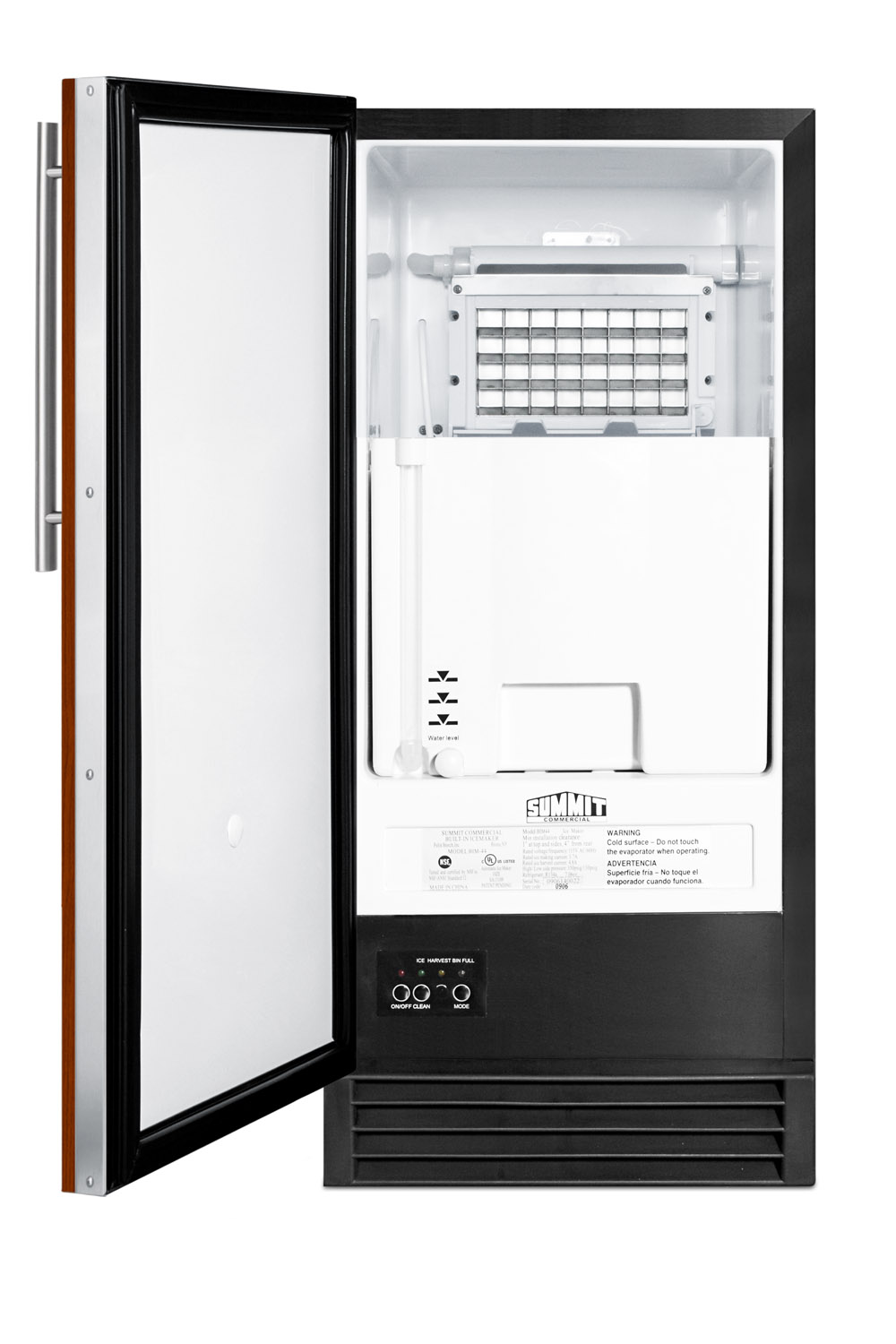 SUMMIT BIM44GIF is an auto defrost clear icemaker designed for true convenience in operation and placement.At just under 15" wide, the BIM44GIF is ideal for finishing any kitchen or wet bar. The door includes an integrated stainless steel frame that can accept full overlay panels for a seamless look that blends into matching cabinetry. Users supply their own handles.Automatic defrost makes maintenance simple and stress-free, while the BIM44GIF's front-breathing cooling system and fully finished sides allow built-in or freestanding use. This model now comes equipped with an internal pump. The BIM44GIF can make up to 50 pounds of clear cube-shaped ice, with an adjustable bin capacity that can temporarily hold up to 25 pounds. The ice is produced in sheets and can be easily broken into cubes using the provided scoop.For this icemaker in an ADA compliant 32 1/2" height, see the BIM44GIFADA. The BIM44GIF is NSF listed for commercial use and is ENERGY STAR certified for commercial use.