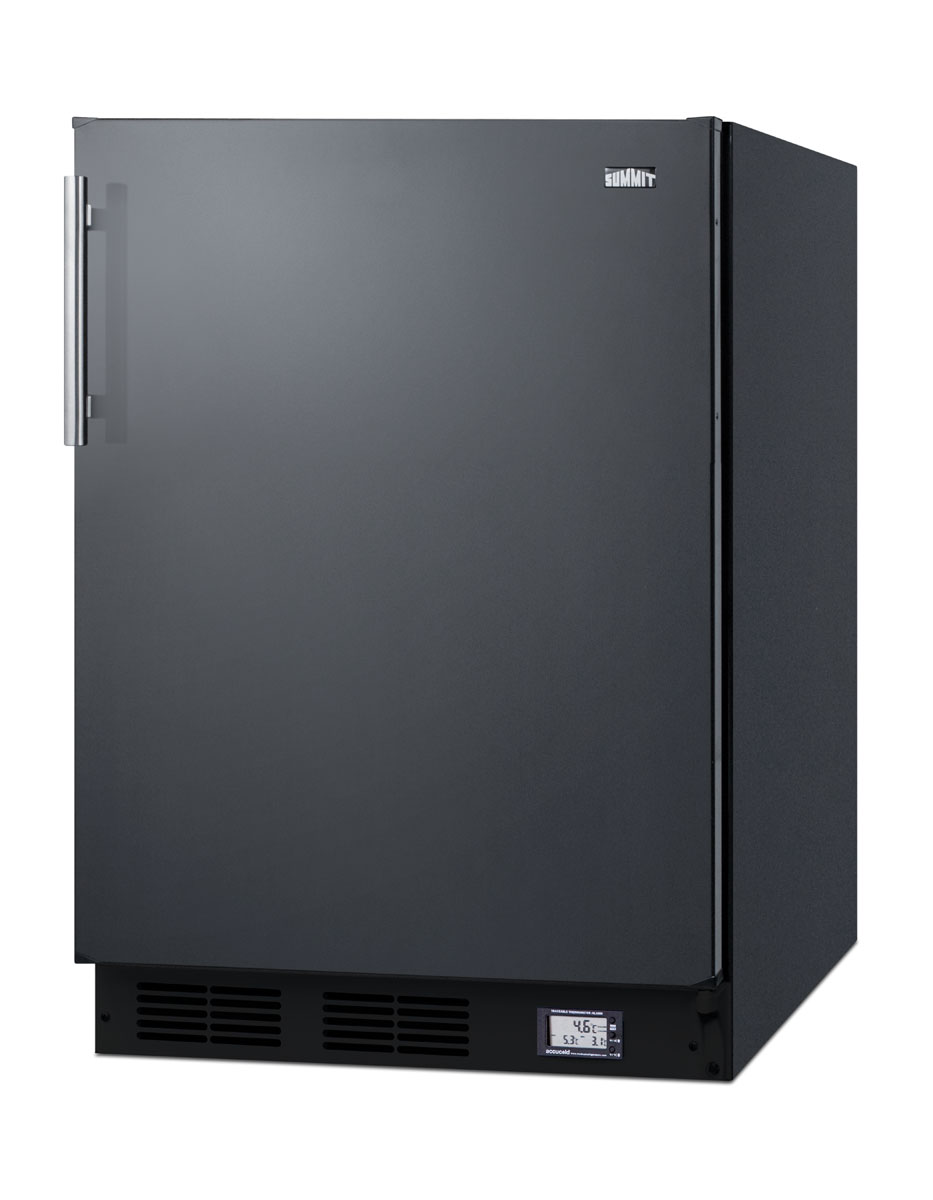 SUMMIT's selection of break room refrigeration features a variety of units for convenient and reliable storage in hospitals, clinics, and other facilities.The BKRF663B is a counter height refrigerator-freezer made in Europe and sized with a 24" footprint. It features a black exterior finish and stainless steel handle, with a user-reversible door swing for added flexibility. A factory-installed NIST calibrated thermometer is located in the kickplate to provide a continuous display of the current and high/low temperatures of the refrigerator compartment to the nearest tenth of a degree. Temperature can be viewed in Celsius or Fahrenheit for added convenience. The device also includes an audible alarm to warn of major temperature fluctuations.Inside, the BKRF663B features a dual evaporator to allow separated cooling of the fresh and frozen food sections. The refrigerated compartment utilizes low maintenance automatic defrost, while the interior freezer compartment is manual defrost to achieve lower storage temperatures ideal for frozen food. Additional features include adjustable glass shelves, a crisper drawer, door racks for condiments and tall bottles, and an automatic interior light. The BKRF663B is designed for freestanding use. For a built-in version, see the BKRF663BBI. Additional styles and ADA compliant sizes are available.Note: Model prefix "BKRF" is a marketing designation. Actual unit will carry Summit model number CT663B.