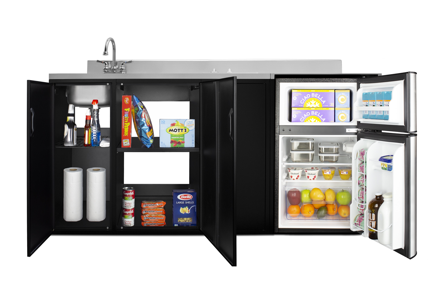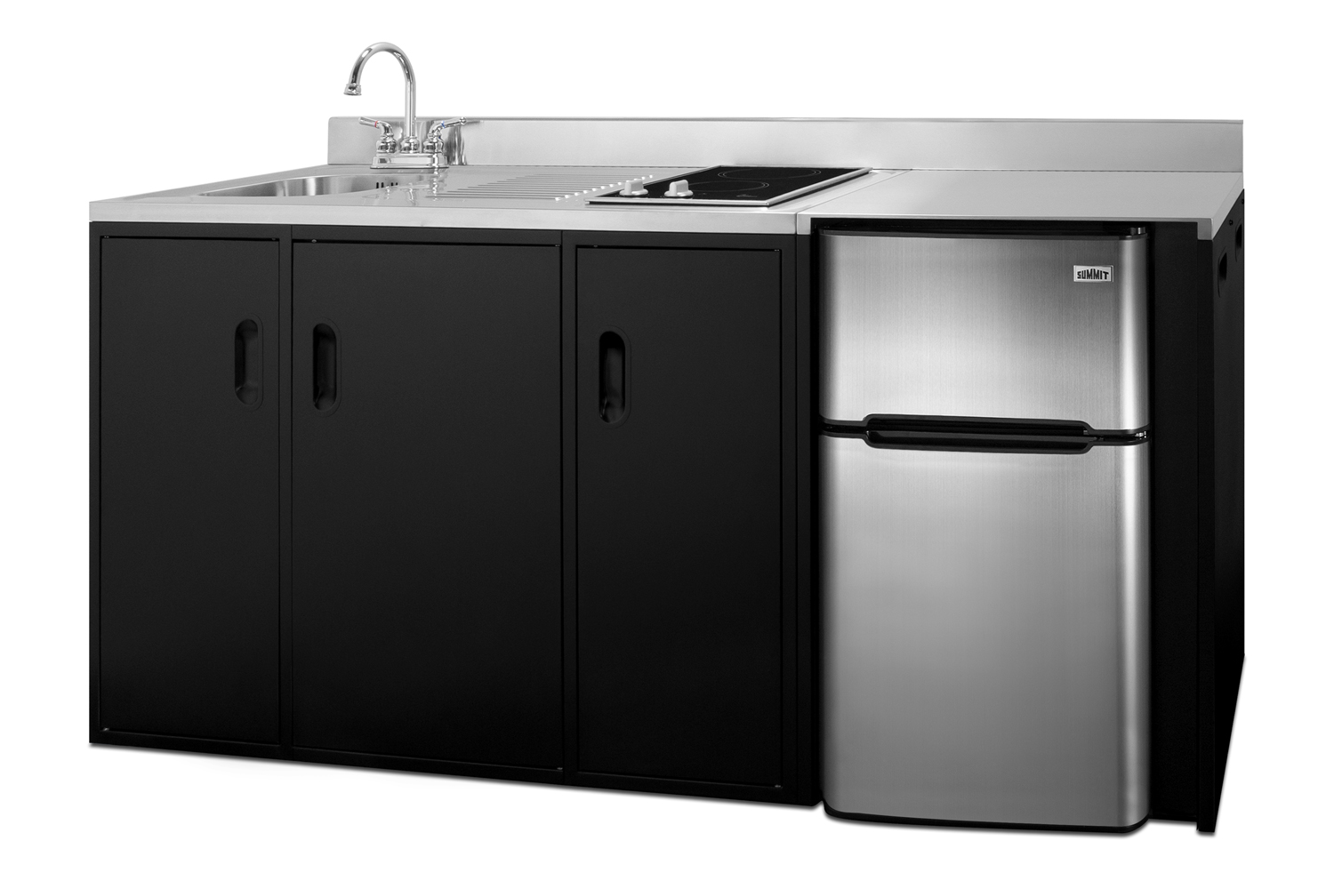 Summit brings true convenience to smaller spaces with all-in-one combination kitchenettes. Available in a variety of sizes and finishes, these units come fully featured with everything you need for the home foodservice experience, including a 2-burner smooth-top cooktop, sink, storage cabinets, and refrigerator with a freezer compartment. The CK72ADASINKL is 72" wide with a 34" ADA counter height for added accessibility. Its black exterior brings a modern look to efficiency spaces, with added touches of stainless steel on the kitchenette work surface and refrigerator doors. This unit includes a built-in 115V smooth-top cooktop with a rear 7" 900W and a front 5½" 500W heating element. The power cord comes pre-installed for easy setup. The left side of the kitchenette features a compact sink with ready-to-use faucet, while the right side has a stainless steel counter area for food prep. Two single-door cabinets include a removable wire shelf, perfect for storing cleaning supplies, while a French-door style cabinet has a sold removable shelf, ideal for dry storage. Two grooved handles on each side allow for easy movement of the unit.Unlike many other brands' kitchenettes, all Summit units include a refrigerator with a freezer compartment to cover all of your cold storage needs. The CK72ADASINKL includes the two-door, ENERGY STAR certified CP34BSS, with 3.2 cu.ft. of storage space. A dual evaporator system separately cools the auto defrost refrigerator section and manual defrost freezer compartment for improved overall performance. This model also includes an adjustable glass shelf, door storage, and a crisper.The CK72ADASINKL is packaged and shipped in one box. Perfect for studio apartments, hotel rooms, dormitories, assisted living facilities, temporary kitchen facilities, and any other location in need of a low maintenance, fully-featured compact kitchenette. For this unit with a sink located on the right of the kitchenette, see the CK72ADASINKR.Note: For users who p