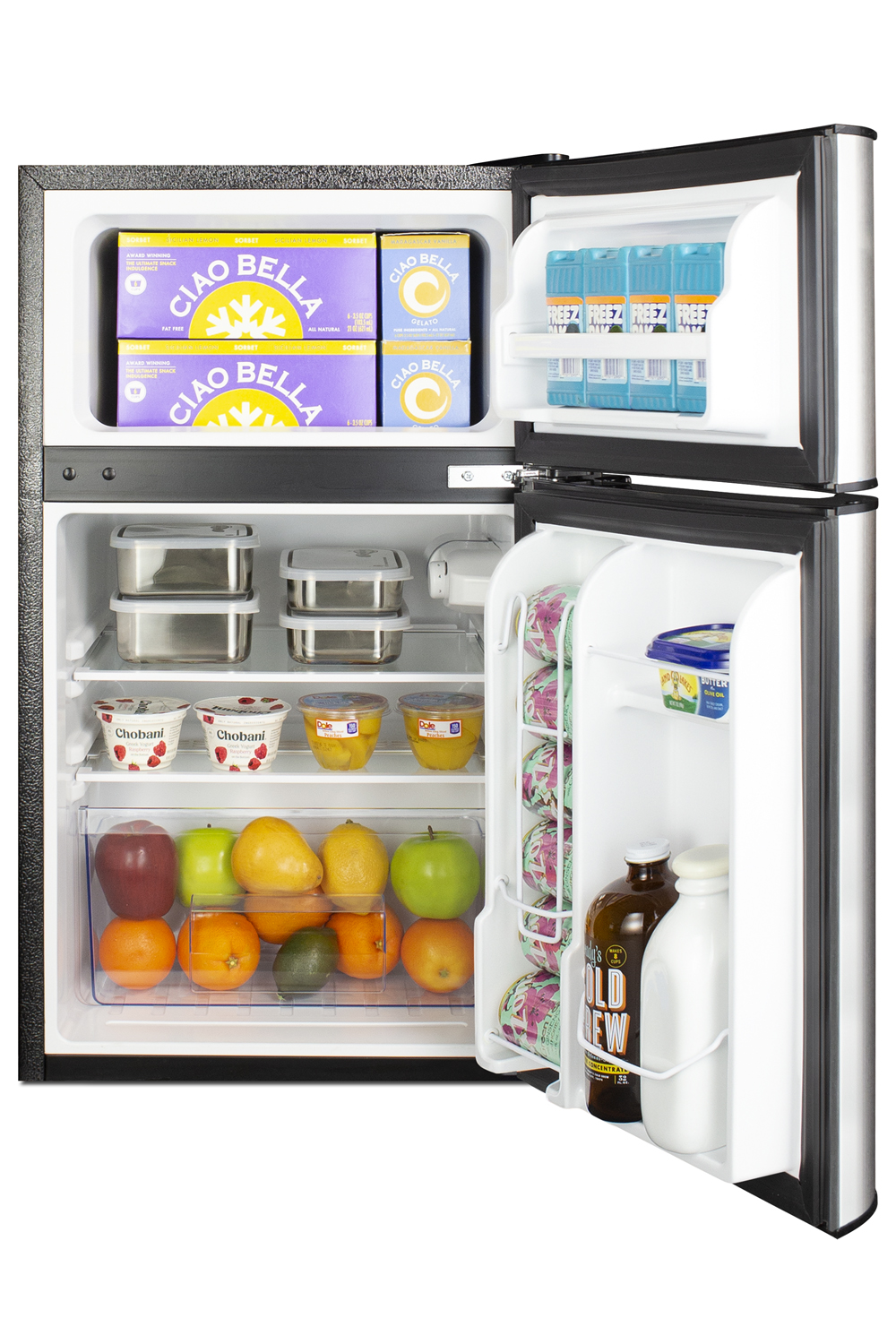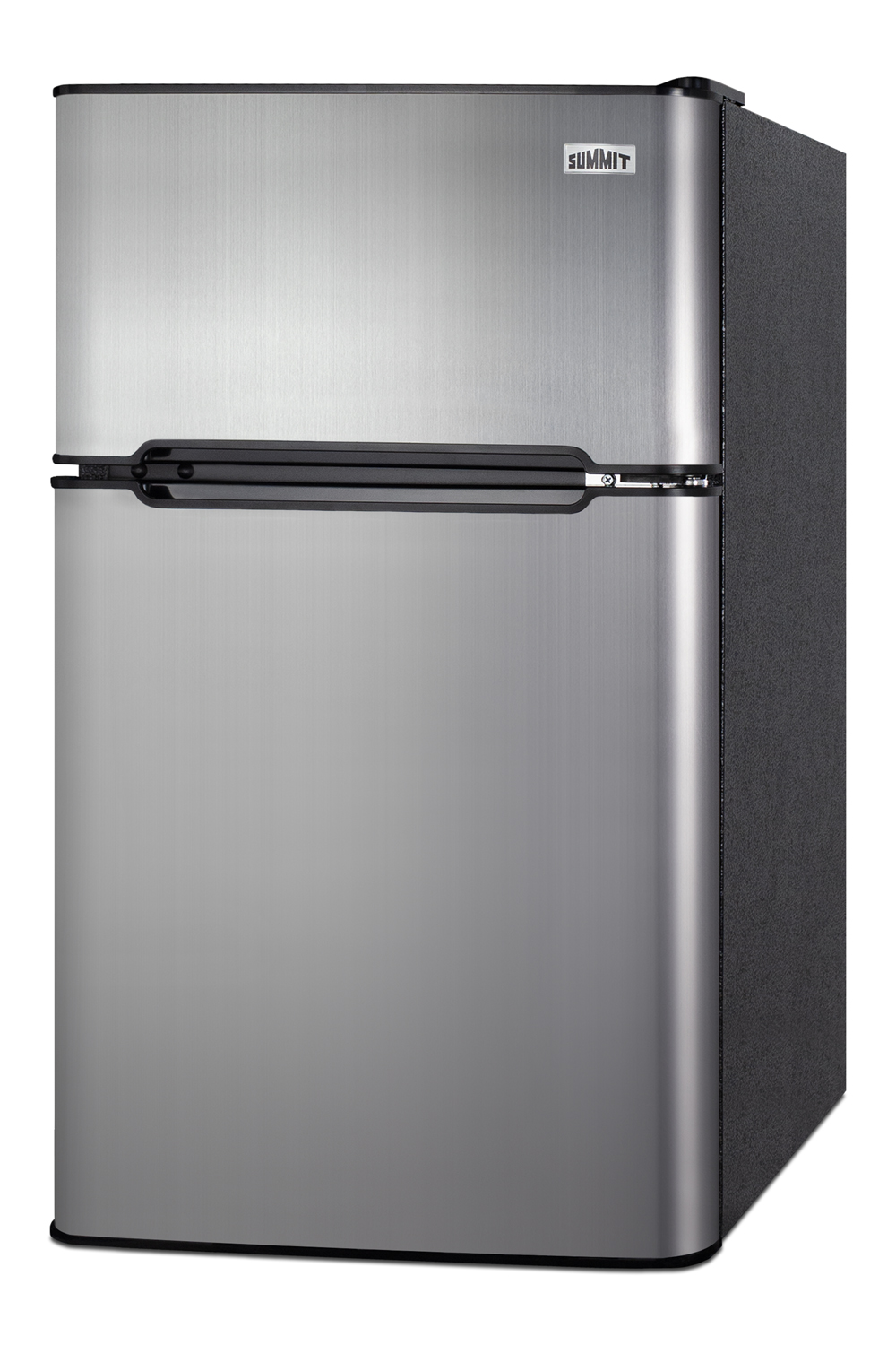 Summit's ENERGY STAR qualified collection of compact refrigerator-freezers offers uniquely sized units with energy-efficient performances.The CP34BSS is a counter height two-door refrigerator-freezer sized at 19" wide. It features a jet black cabinet and reversible stainless steel doors for added convenience. This unit is designed for freestanding use. It has a sealed back that allows for a better fit and easier cleaning. Two leveling legs help to ensure the unit is even when placed on uneven surfaces.Inside, the CP34BSS utilizes a dual evaporator system to separately cool the auto defrost refrigerator section and manual defrost freezer compartment for improved overall performance. The refrigerator includes an adjustable glass shelf for protection against spills, a large crisper drawer to keep produce fresh, and door storage for tall bottles. The "Dispense-A-Can" door compartment can hold up to six standard-sized beverage cans for convenient access. A dial thermostat with seven temperature settings make for easy temperature management, while an interior light illuminates the white interior for an easy view of stored contents. The generously sized freezer section includes a large door shelf for easy storage. An ice scraper and ice cube tray are also included.The CP34BSS is ENERGY STAR qualified with an efficient performance designed to save on utility costs and energy usage. With its unique size and quality design, this unit is ideal for college dorms, small apartments, offices, and other settings in need of a reliable, energy-efficient compact refrigerator-freezer. For this unit in white, see the CP34W.