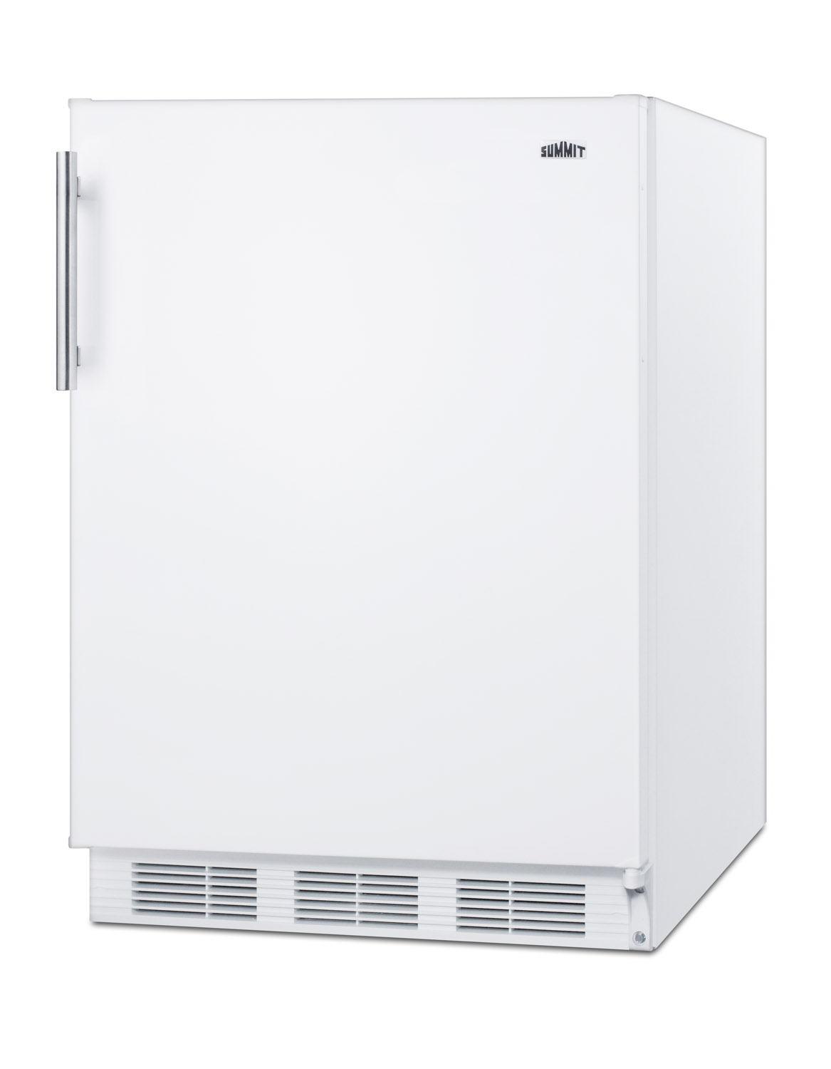 Summit's Peak24 series of undercounter European-made refrigeration features energy efficient, ADA height choices that offer the largest capacity in the industry for recessed installation in 24" openings.Sized with a 24” footprint, the ENERGY STAR certified CT661WADA refrigerator-freezer offer a generous 5 cu.ft. storage capacity, larger than many units in this size class. The 32” height allows use in settings complying with ADA guidelines for lower counter height. This model features a white exterior finish with a user-reversible door swing. A stainless steel handle completes the look. Inside, the CT661WADA features a dual evaporator to allow separated cooling of the fresh and frozen food sections. The refrigerated compartment utilizes low maintenance automatic defrost, while the interior freezer compartment is manual defrost to achieve lower storage temperatures ideal for ice cream and other frozen food. The deluxe interior includes adjustable glass shelves for spill-proof storage and easier cleaning, as well as a scalloped wine shelf to hold wine and champagne bottles safely in place. Door racks offer additional convenience for tall bottles and condiments and a clear crisper drawer ensures your produce is stored under the ideal conditions. This model includes automatic interior lighting and an adjustable dial thermostat.The CT661WADA is UL listed for residential use. With its large capacity and user-friendly features, this unit is a convenient option for homes, offices, schools, and other settings in need of reliable cold storage. Additional choices are available in standard counter height. Browse the full Summit catalog to discover the perfect appliance for your refrigeration needs.