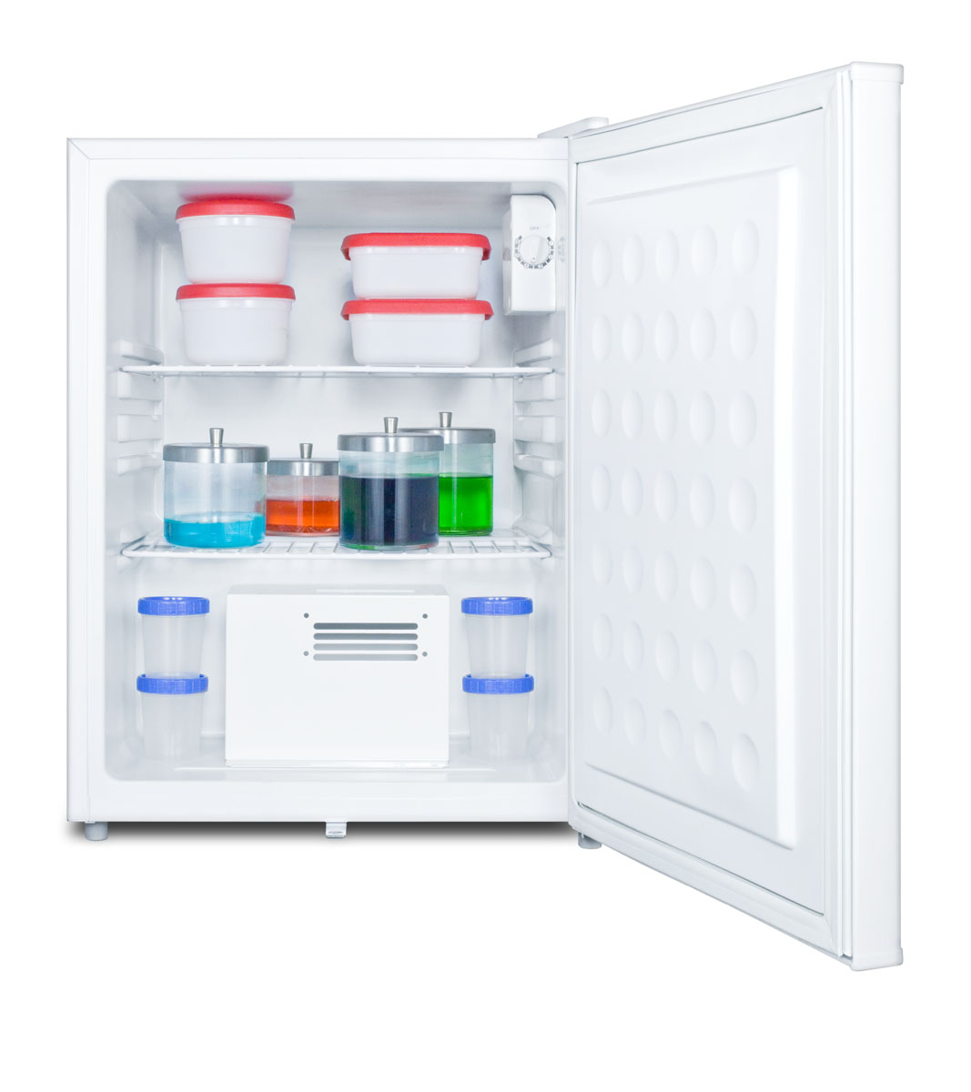 Accucold by Summit Appliance's FF28LWH is a compact automatic defrost all-refrigerator ideally sized for countertop use.Sized just under 19" wide and 25" high, the FF28LWH offers 2.4 cu.ft. of storage capacity in a compact footprint. The interior includes one full-size adjustable wire shelf, one removable half shelf, and a flat door liner.The FF28LWH uses automatic defrost for low maintenance operation, with an adjustable mechanical thermostat conveniently located towards the front for easy access. The reversible door includes a factory installed lock.Note: Accucold's general purpose refrigerators are intended for a wide variety of basic storage of non-critical products. For storage of high-value vaccines, life science materials, and medical or clinical biologicals, browse Accucold's Medical & Laboratory or Pharmacy & Vaccine Storage categories, or contact our product specialists to discuss your options at 1-888-4-MED-LAB.