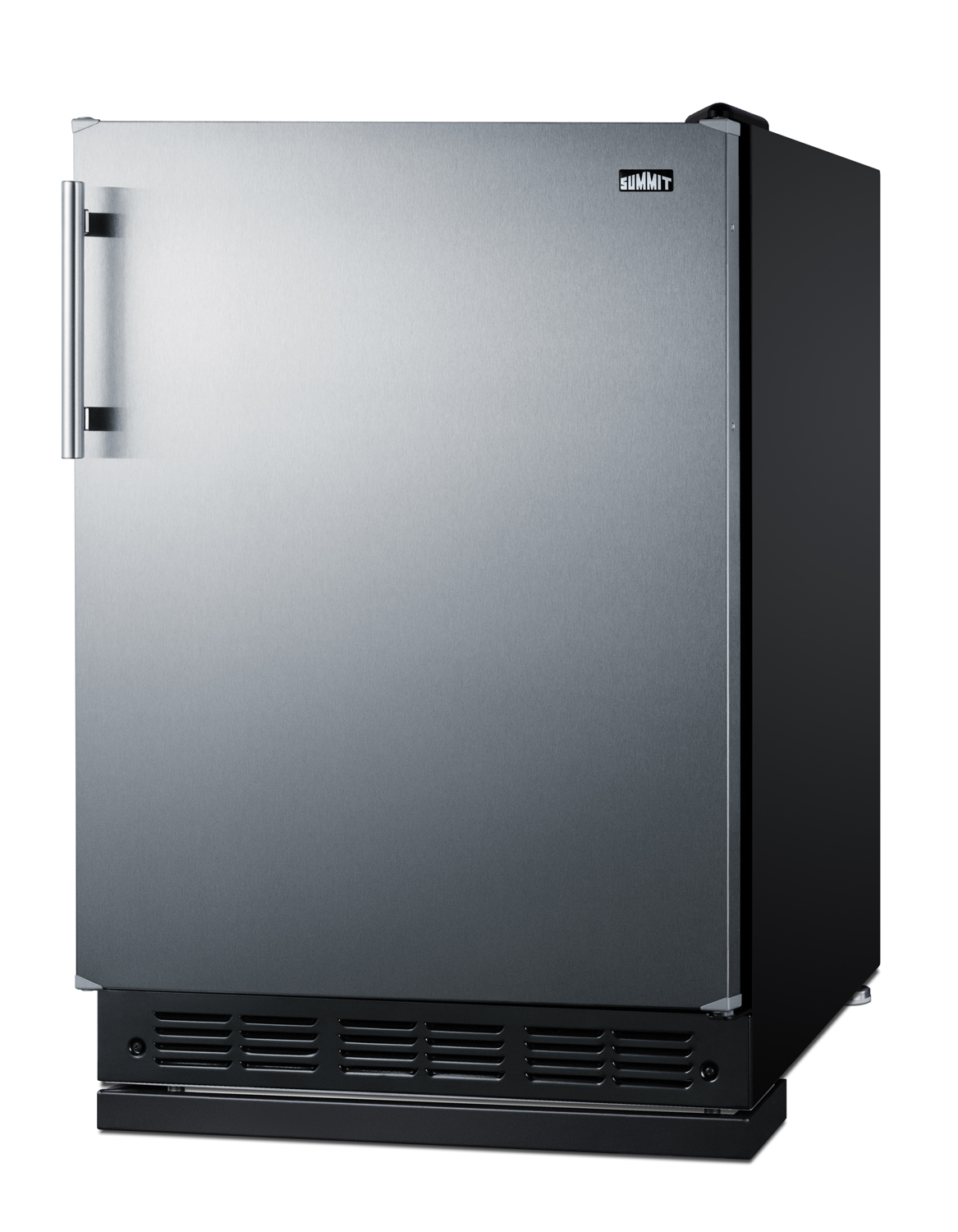 Summit's undercounter lineup of European-made refrigeration features energy efficient, counter height choices that offer the largest capacity in the industry.Sized with a 24" footprint, model FF6BK2SSRS is an ENERGY STAR certified all-refrigerator designed for recessed installation or freestanding use in residential kitchens. The user-reversible stainless steel door offers an elegant look for any kitchen, with a special coating that makes it easy to wipe off the surface for a fingerprint-resistant front. The stainless steel handle is side mounted for an easy grip and attractive look. This unit has a jet black exterior cabinet and runs quietly at less than 33 dB. Adjustable legs allow you to set the height between 33 1/2" and 34 1/2" for the perfect fit. We include a black steel leg shield for optional use if you find there is too much space between the front and floor when the unit is set at its taller height.With a full 5.8 cu.ft. interior, the FF6BK2SSRS offers a higher storage capacity than other counter height units in the market. It features a black interior liner and black trimmed adjustable glass shelves for spill-proof storage. We also include a removable scalloped steel rack ideal for holding bottles in a horizontal position. A large clear crisper makes it easy to store produce at its best and three clear door racks let you keep condiments in easy reach. A light automatically illuminates the interior when the door is open. Summit's European lineup features classic mechanical controls. The dial thermostat ensures an intuitive, trouble-free performance without any internal boards or chips. Automatic defrost reduces user maintenance and our signature cold wall design creates an efficient, reliable cooling system. The FF6BK2SSRS is UL listed for residential use. With its large capacity, professional finish, and user-friendly features, this freezerless refrigerator is a convenient option for homes, offices, schools, and other settings in need of reliable cold st