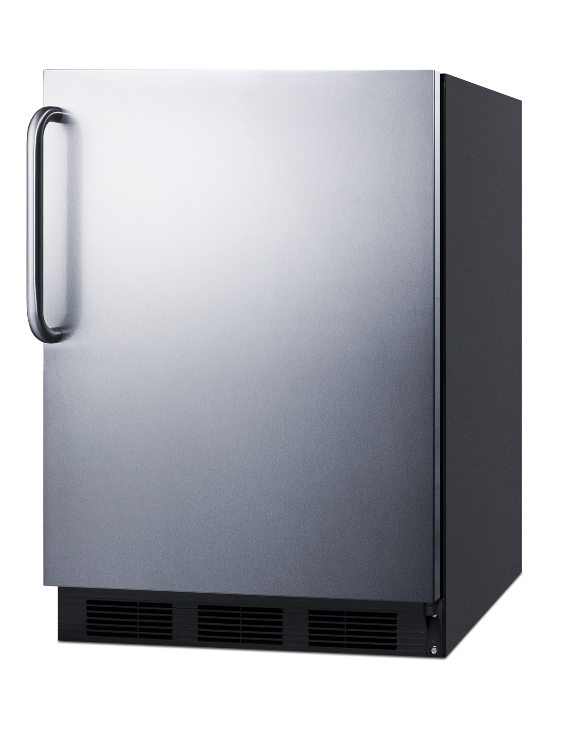 Accucold by Summit Appliance offers a wide range of all-refrigerators for general purpose storage. The commercially listed FF7BIADA Series features 24" wide all-refrigerators designed for built-in installation under lower ADA compliant counters.The FF7BKBISSTBADA is a 32" high all-refrigerator with a full 5.5 cu.ft. capacity inside a slim 24" footprint. The front-breathing design allows built-in use under counters, while the fully finished cabinet also lets this unit be used freestanding. This model has a black cabinet and stainless steel wrapped door. A curved towel bar handle in brushed stainless steel completes the professional look.Inside, the FF7BKBISSTBADA utilizes low maintenance automatic defrost operation. Our unique "hidden" evaporator is set behind the rear wall to create a seamless, easy-to-clean interior that also maximizes shelf space. This unit has a flat door liner that allows it to accept larger trays (up to 19 1/2" x 16"). Adjustable glass shelves allow users to reconfigure the interior to accommodate a variety of sizes. The interior light is controlled by an on/off rocker switch located behind the thermostat dial.The FF7BKBISSTBADA is ETL-S listed to NSF-7 standards for use in commercial establishments. For more finish options, browse the entire FF7BIADA Series.NOTE: This unit is designed for general purpose or commercial applications and does not meet DOE energy standards for residential use.