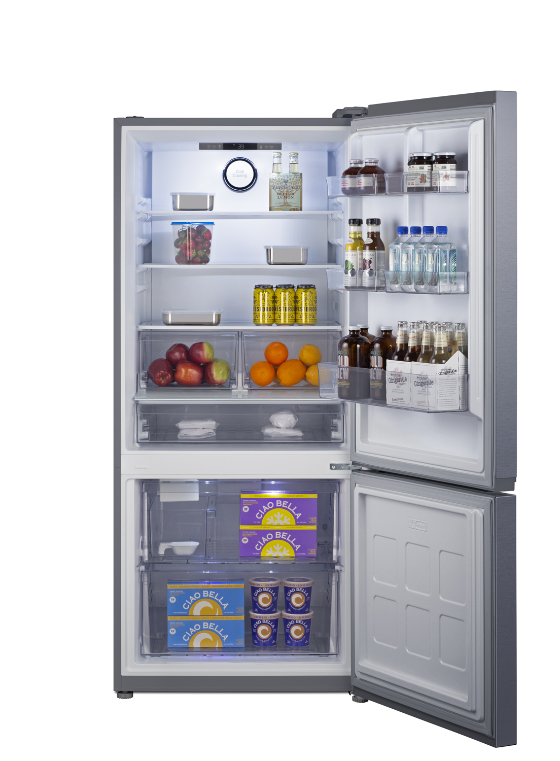 Summit's fully-featured, bottom-mount refrigerator-freezers are specially designed to bring modern style and true convenience to any kitchen. The ENERGY STAR certified FFBF174SSIM is conveniently sized at 30" wide. Stainless steel doors feature pocket handles and an attractive horizontal grain, with a smooth silver cabinet for a stylish modern look in any kitchen. The sealed back offers added space savings and easier cleanup. Both doors are user-reversible to best suit your space.Inside, the FFBF174SSIM boasts a generous 16.1 cu.ft of storage space to meet the storage needs of any family, no matter their size. This model utilizes frost-free operation for low user maintenance. The interior includes three adjustable glass shelves, two half-width produce crisper drawers, and a full-width deli drawer for easy storage. The refrigerator door includes four half shelves and one full gallon shelf to safely store bottles and other condiments. An innovative digital system lets you manage the refrigerator and freezer temperature with an intuitive digital thermostat. LED lighting in the side walls of the refrigerator offers an efficient and attractive view inside. The open door alarm alerts with an audio and visual signal when the door is left ajar for over one minute. This unit is equipped with an optional sabbath mode feature that allows you to deactivate certain electrical features for up to 72 hours.The FFBF174SSIM's large freezer section features one plastic slide-out drawer that help protect your stored items from warmer temperatures when the door is opened. A factory-installed icemaker keeps a full supply of ice on hand. A QuickFreeze setting lets you run the freezer at colder temperatures, ideal for freezing newly loaded groceries. With its ENERGY STAR certified performance, attractive design, and convenient features, the FFBF174SSIM is the ideal choice for kitchens looking for an energy-efficient refrigerator-freezer. For this unit with French doors, see model FDRD175SS