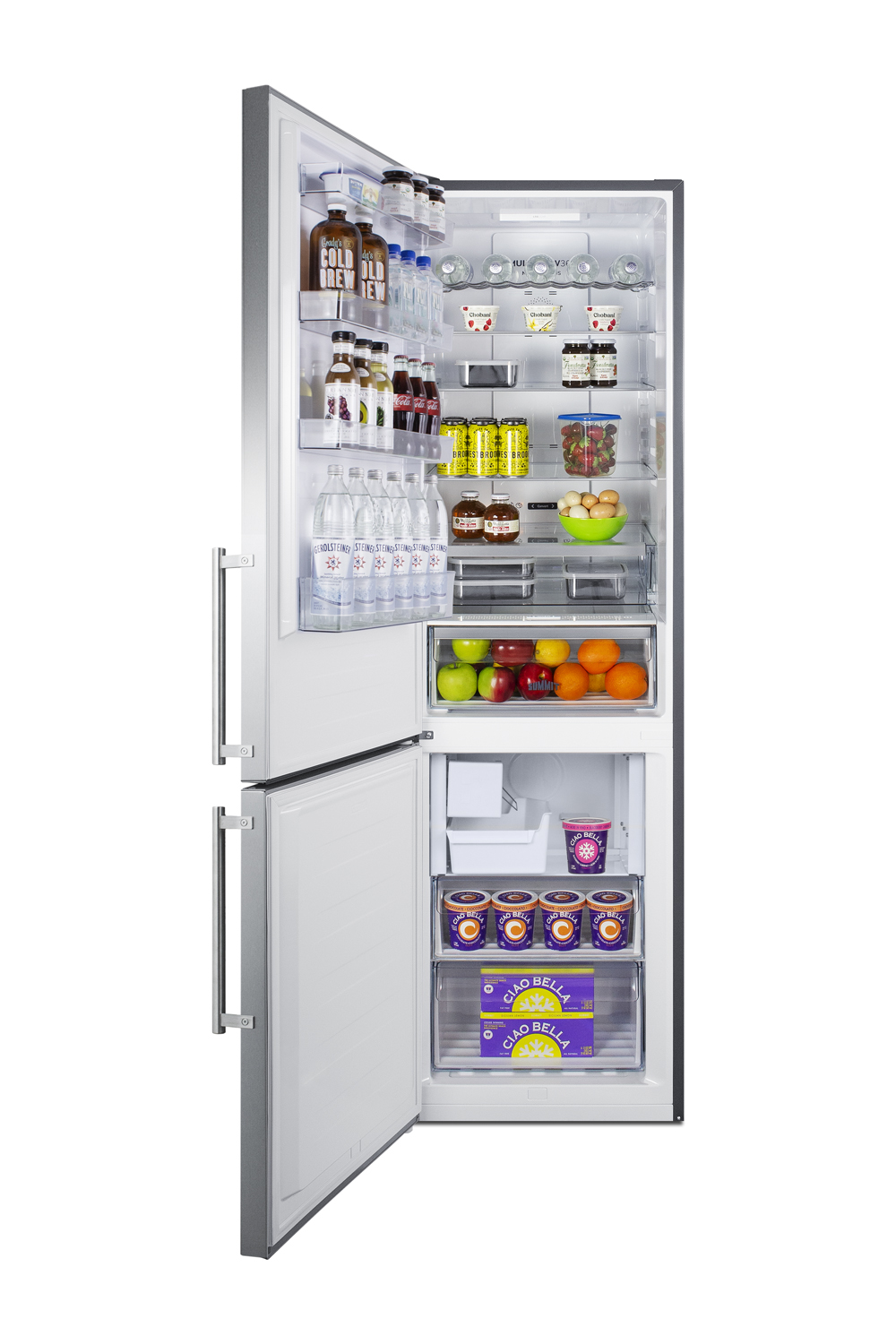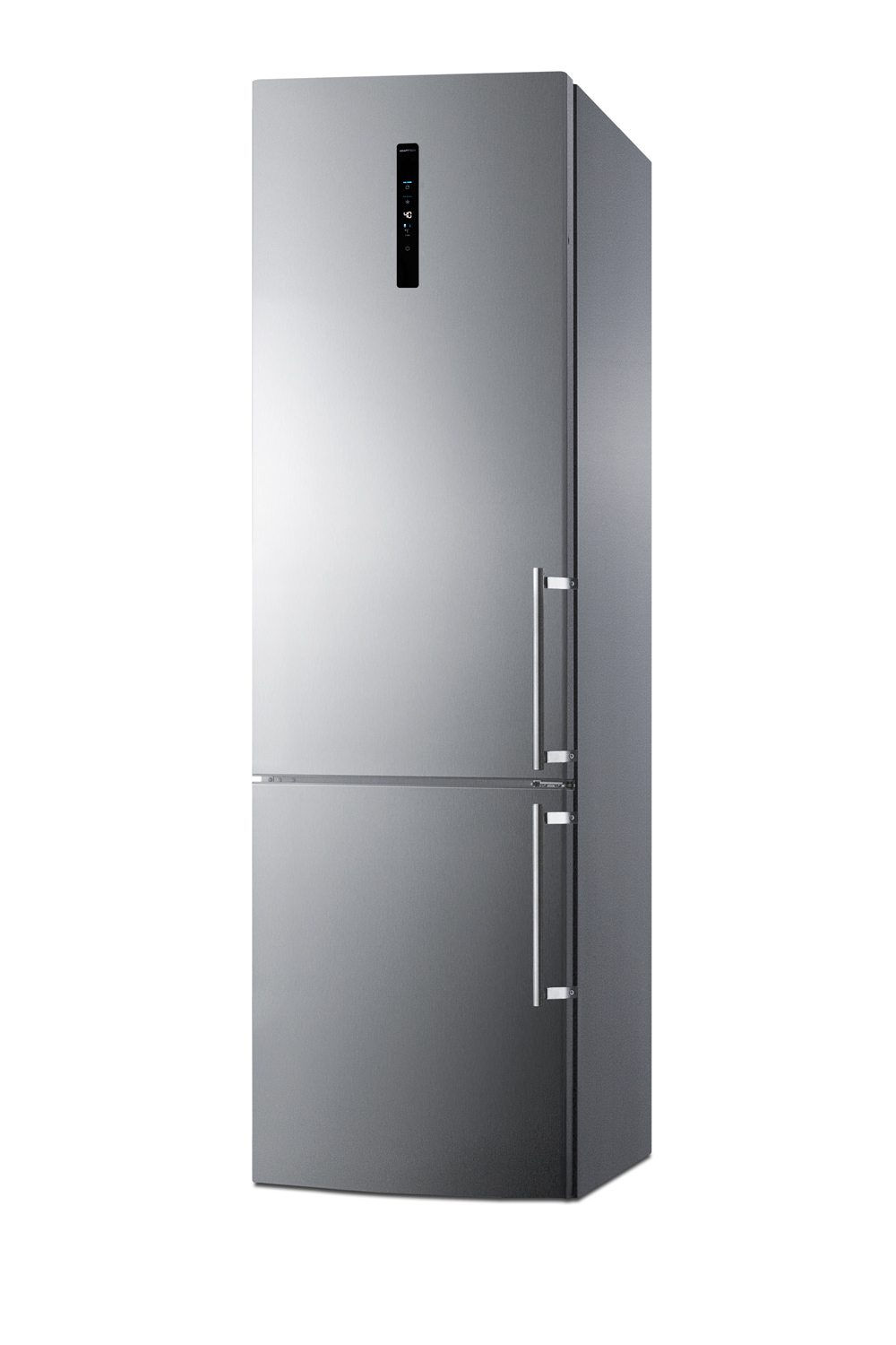 Bring European luxury to small kitchen spaces with Summit's premium counter depth bottom freezer refrigerators, sized with a 24 inch footprint for an easy fit and available with factory-installed icemakers for user convenience.Model FFBF181ES2IMLHD offers nearly 12 cu.ft. of storage capacity in a uniquely slim and shallow fit under 24". The real stainless steel doors feature a vertical grain and a gentle curve, with pro style handles and a textured gray cabinet to complete the elegant, modern look. The sealed back and right angle plug help to ensure a clean fit. This unit comes with a left hand door swing (see model FFBF181ES2IM for a right hand version). Designed and manufactured in Europe, the FFBF181ES2IMLHD features advanced cooling technology. The digital control panel is located on the door's front, allowing you to adjust the refrigerator or freezer temperature without opening the door. Audible and visual high temperature and open door alarms helps to protect stored contents, while the child lock prevents unnecessary adjustments. The frost-free interior utilizes a MultiFlow Fan system to evenly distribute temperature. This refrigerator is designed with AdaptTech, adaptive intelligent technology that adjusts the cooling to your habits based on the frequency of door openings. Additional features include a fast freeze setting (ideal for loading groceries) and an eco setting. Inside, the FFBF181ES2IMLHD is designed to maximize storage convenience with LED lighting providing a clean display. The refrigerator section includes three slide-out adjustable shelves in spill-proof glass with stainless steel front trim for an attractive look. We also include an adjustable scalloped steel rack to hold bottles in place. Four removable door shelves offer flexible condiment and bottle storage. This unit includes a large humidity-controlled crisper drawer and a FreshZone deli drawer that can hold colder temperatures for meat or be converted to regular crisper conditions with an