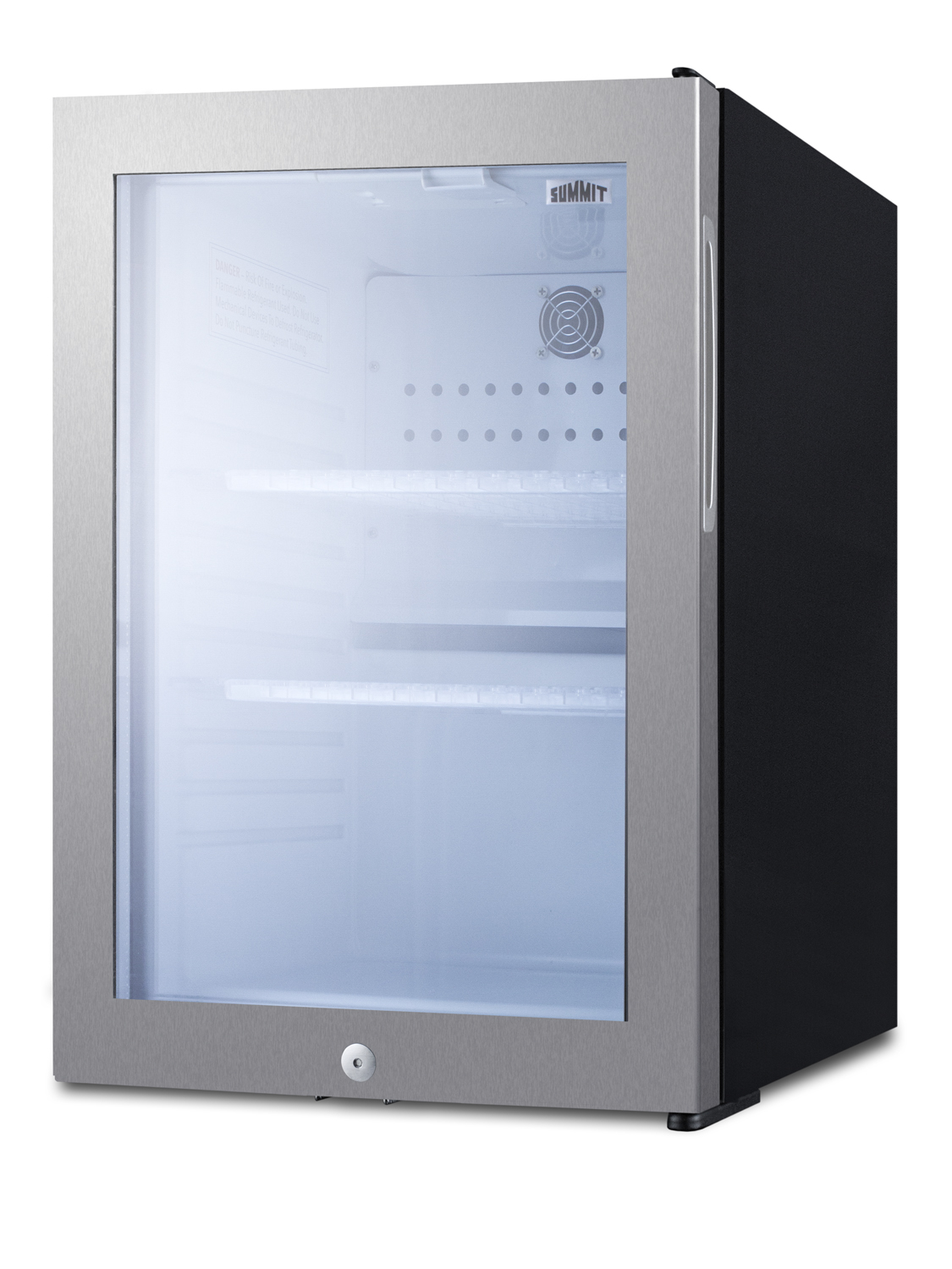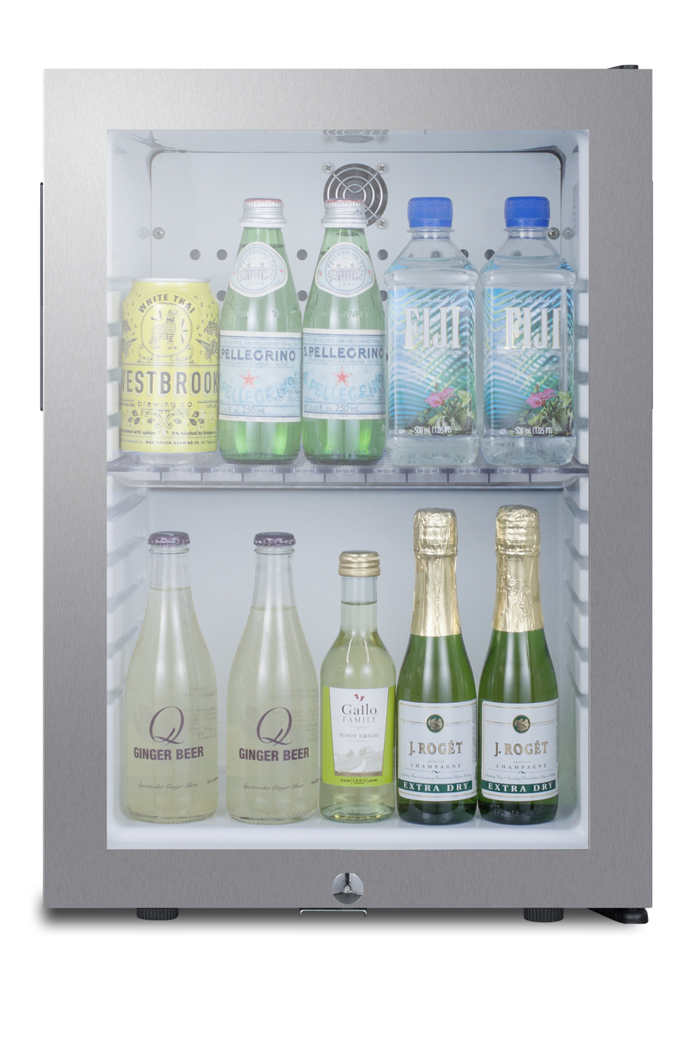 Summit offers a selection of minibars perfectly sized for compact spaces. Sized at under 16 inches wide, the MB27GLSS is a compact freestanding minibar with a black cabinet finish. The user-reversible double pane tempered glass door features a seamless stainless steel trim for a more deluxe presentation. A factory-installed lock offers convenient security.Inside, the MB27GLSS has 1.2 cu.ft. of storage space and a white interior for brighter visibility of contents. A compressor-based cooling system ensures proper refrigeration to keep stored items cold, while the laboratory-tested operation keeps it quiet with a sound level of 34.5 decibels, sure to not disturb guests' sleep. Two removable half shelves, with ten placement options, help to maximize storage capacity. The LED light illuminates the interior for quick viewing, and the automatic defrost ensures minimum user maintenance. This unit includes digital controls for easy temperature management.With a compact size and user-friendly design, the MB27GLSS is the perfect choice for hotels, offices, and other settings in need of reliable, quiet cooling in a slim fit.