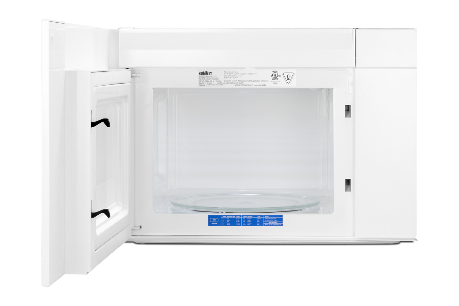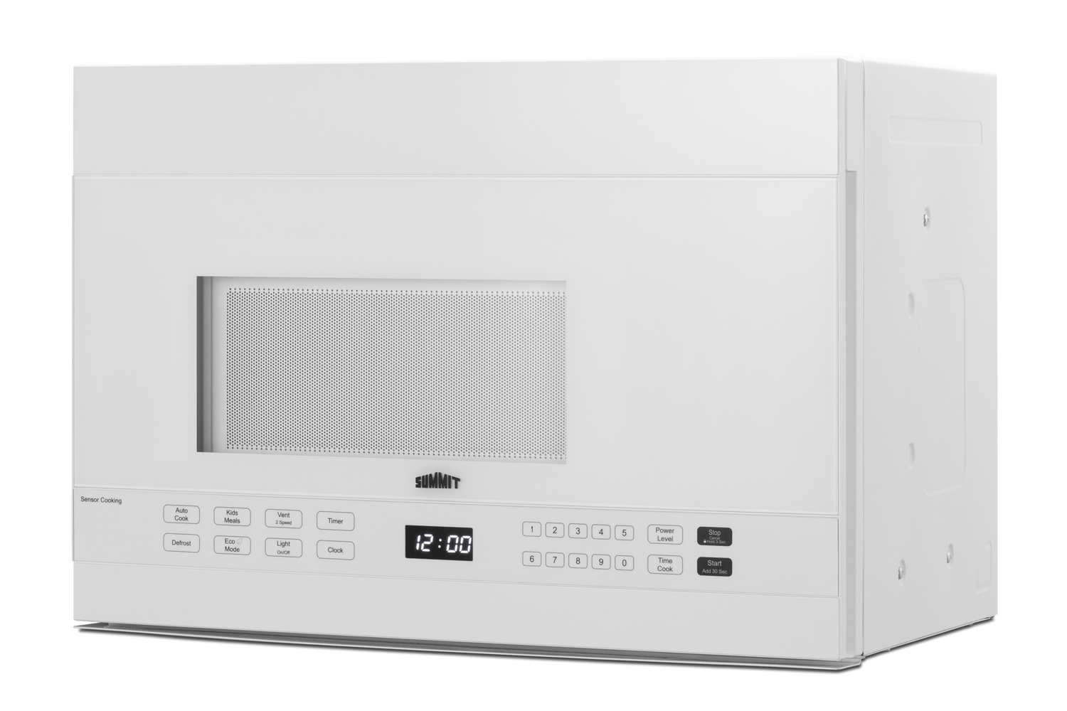 Summit's selection of microwave ovens offer complete cooking power in slim, stylish designs, ideal for smaller kitchens. The MHOTR241W is a 24" wide over-the-range microwave designed for simple one-touch cooking and effective ventilation. Its all-white exterior and interior makes for easy cleanability, while a small window affords the opportunity to keep watch of your cooking. A side pocket handle offers a more streamlined look to complement any kitchen style. Inside, the MHOTR241W offers a full 1.4 cu.ft. capacity with an oversized 12.75" glass turntable. Ten power levels and multi-stage cooking options allow you to set the proper conditions for virtually every meal. The auto cook feature makes for convenient cooking and reheating for almost any food or beverage with pre-programmed settings for pizza, popcorn, beverages, cheeses, ice cream, butter, meats, veggies, and reheating. Submenus for meats, reheat, and veggies allow users to select by item, such as pork, chicken, casserole, dinner plate, or fresh and frozen veggies. An auto cooking decal is affixed to the lower cabinet interior for easy reference. The kids meal setting lets you heat common meals such as chicken nuggets, hot dogs, fries, and frozen sandwiches. Defrost settings offer the choice of heating by time or weight, while the Add 30 seconds feature provides additional cook time for user convenience. The MHOTR241W also includes a time cook function, timer, and interior light for easy viewing of the interior. The MHOTR241W is equipped with a versatile ventilation system that can be set up with a vertical duct, horizontal duct, or for recirculating (ductless) operation with two grease filters and a charcoal filter included. A two-speed exhaust fan, which begins automatically, assures a smoke and odor-free environment. Two LED lights offer efficient illumination for your cooking surface, while the child lock feature helps prevent unsupervised use by children for added safety. Eco Mode disables the display