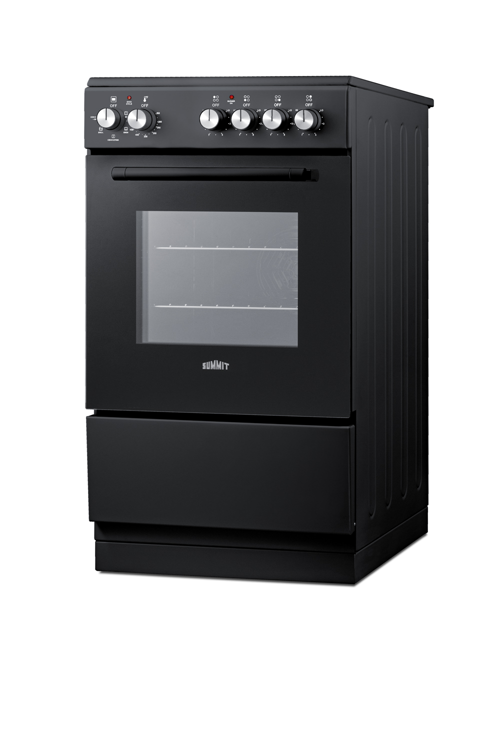 Summit's innovative series of European-made ranges offers full cooking convenience for apartments, ADUs, tiny homes, and other settings with limited kitchen space. Made in Europe, the REXT20BL is a 220V electric range sized at just under 20" wide with a depth under 24" making it ideal for L or U-shaped kitchens. For safer heating and easier clean-up, these units feature a smooth glass cooking surface. There are four 6" burners to ensure this unit can accommodate everyday cooking needs.The versatile design includes a removable 2" high matching black backguard, allowing you the choice of a standard range style or a slide-in look with a flat surface that allows you to better integrate the unit with your own backsplash design. For added space savings, the REXT20BL features a slide-out drawer, perfect for storing your pots and freeing up more kitchen space.Inside, the REXT20BL features a large 1.87 cu.ft. oven made from durable porcelain enamel and includes two sliding wire racks with five positions to let you fit various dish sizes. The large oven window provides a full view of your cooking, with an interior light that automatically turns on with the oven. The oven door is constructed from low-e glass in black for a modern look, with a sleek black finish on the cabinet, storage drawer, and manifold. The REXT20BL comes with multiple cooking functions to cater to various cooking methods. The oven settings include: defrost, static cooking, convection(fan), broiling, and even a broiling + convection(fan) function. All cooking controls meet ADA guidelines since each is located upfront, eliminating the danger of reaching across the cooktop surface. For this unit in stainless steel or white see models REXT20SS and REXT20W. For a 24" wide unit, see model REXT24BL.Browse our website to view our complete collection of ranges and cooking appliances at summitappliance.com.