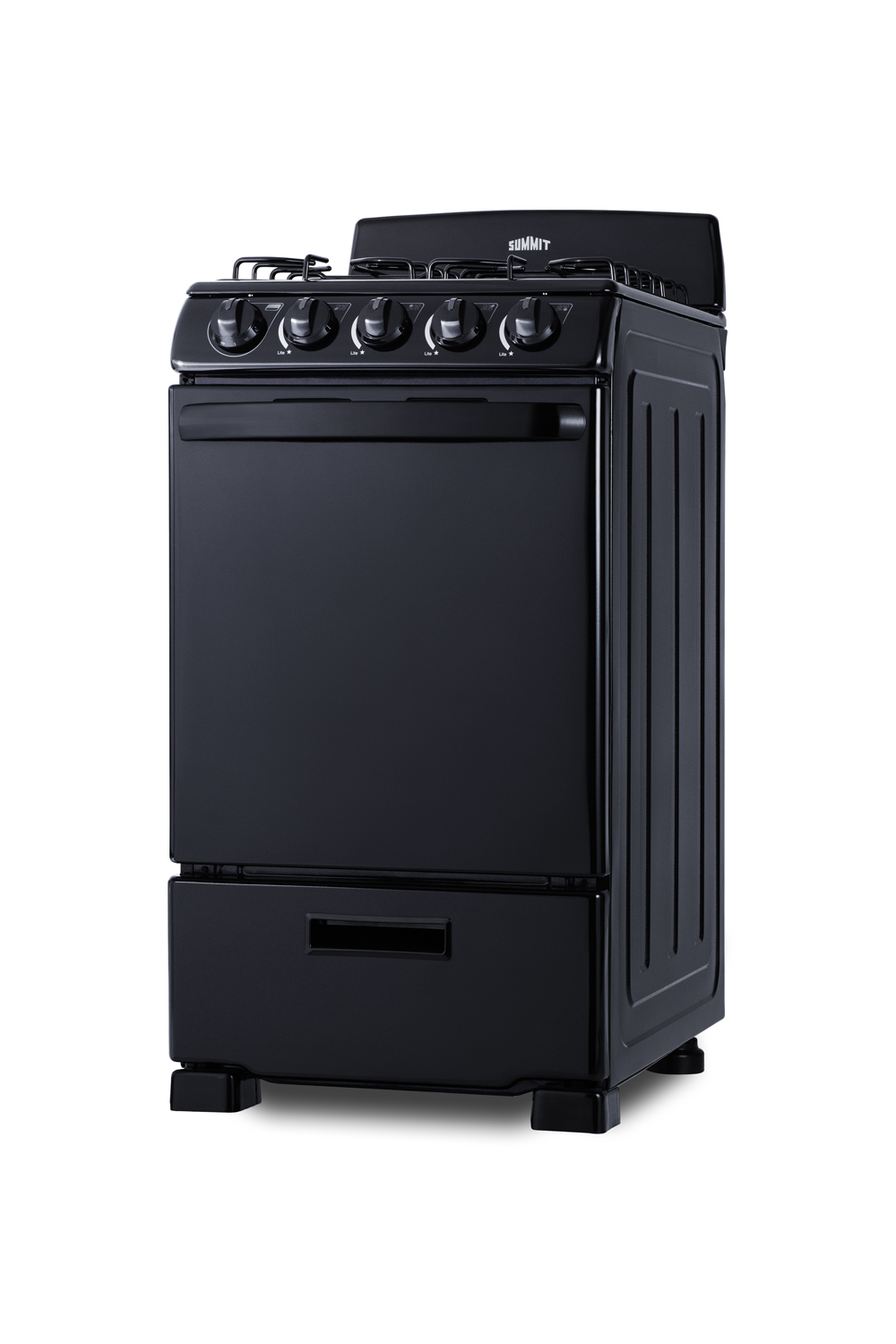 Summit's line of slim-fitting gas ranges made in North America brings quality and value to space-challenged kitchens.The RG201B is a 20" wide gas range designed for an easy fit in smaller kitchen spaces. The 2.3 cu.ft. oven includes two slide-out racks with a safety brake system, with four position options to let you accommodate all sizes and shapes. The broiler is located in a lower drop-down compartment. The RG201B comes in a jet black finish, with color-matched push-to-turn knobs and an easy-to-grab handle. This model utilizes electronic spark ignition and features four sealed burners for safer, cleaner cooking. One 12,000 BTU burner offers faster cooking for larger vessels, with two standard 9,500 BTU burners and a smaller 5,000 BTU burner for lower heating needs. The high backguard helps to protect your walls from spills, with enamel grates for lasting durability. The unit ships set for natural gas but includes its own LP kit for aftermarket conversion. With its clean look and unique size, the RG201B s the ideal gas range for apartment and small home kitchens. For this unit in a white finish, see model RG200WS.