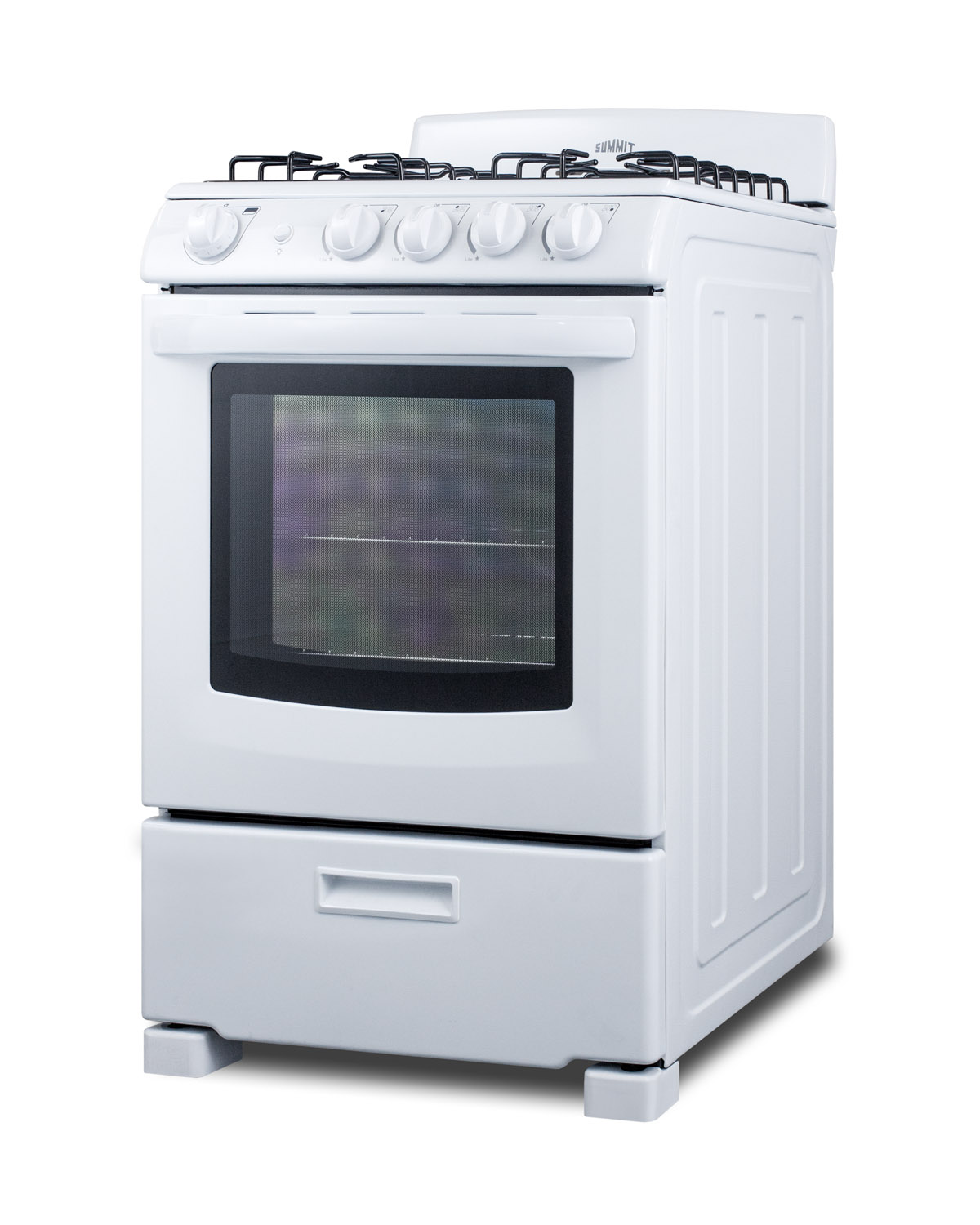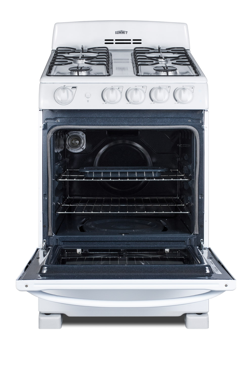 SUMMIT's line of slim-fitting gas ranges made in North America brings quality and value to space-challenged kitchens.Sized at 24" wide, the RG244WS features a large oven with an interior light and wide window for easy cooking visibility. Two slide-out racks include a safety brake system, with four position options to let you accommodate all sizes and shapes. The broiler is located in a lower drop-down compartment. We include a two-piece broiler pan with lid. The RG244WS comes in a classic white finish, with color-matched push-to-turn knobs and an easy-to-grab handle. This model utilizes electronic spark ignition and features four sealed burners for safer, cleaner cooking. One 12,000 BTU burner offers faster cooking for larger vessels, with two standard 9,500 BTU burners and a smaller 5,000 BTU burner for lower heating needs. The high backguard helps to protect your walls from spills, with enamel grates for lasting durability. The unit ships set for natural gas but includes its own LP kit for aftermarket conversion. With its clean look and unique size, the RG244WS is the ideal gas range for apartment and small home kitchens.NOTE: This unit replaces model RG244W but features an upgraded sealed burner design.