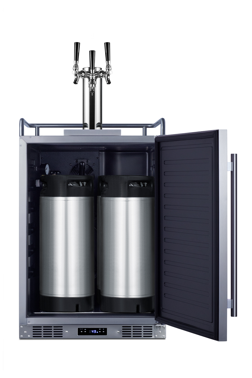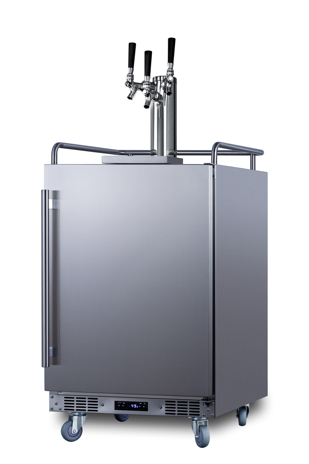 Summit manufactures a complete line of versatile kegerators capable of built-in installation in indoor or outdoor home settings.The SBC683OSTRIPLE is a full-sized beer dispensers approved for both residential or commercial use. Sized at just 24" wide, it features a front-breathing system for built-in installation and a fully-finished cabinet that also allows freestanding use, with an included caster set for optional mobility. The exterior door and cabinet feature 304 grade stainless steel construction for safe, weatherproof use in the outdoors. The user-reversible door includes a pro style vertically mounted handle to complete the look. Additional features include a removable two-piece stainless steel drip tray to collect spills and a chrome guard rail to help keep glasses and mugs in place. This unit has a sealed rear for added protection from the elements.Inside, the 5.6 cu. ft. interior can accommodate a full half or quarter keg, or up to three Cornelius or sixth barrel kegs. We include a complete commercial grade tap kit for dispensing your favorite beer, including a Sankey tap system and triple tap draft tower, along with a CO2 tank and regulator. A tap cool system keeps your beer cold as it goes through your tower, and a Velcro strap holds the tank in place. The floor is constructed from stainless steel for added protection when loading and removing kegs. Two chrome shelves, with six placement options, allow the kegerator to also function as a beverage refrigerator. A digital thermostat makes it easy to manage the wide range temperature, while the external digital display has a readout in Celsius or Fahrenheit. Automatic defrost operation ensures minimal user maintenance. The Memory IC function recovers the unit's last settings in the case of a power outage or disruption. With its solid construction, user-friendly features, and attractive design, the SBC683OSTRIPLE is the perfect beer dispenser for indoor or outdoor kitchens. Additional choices are available w