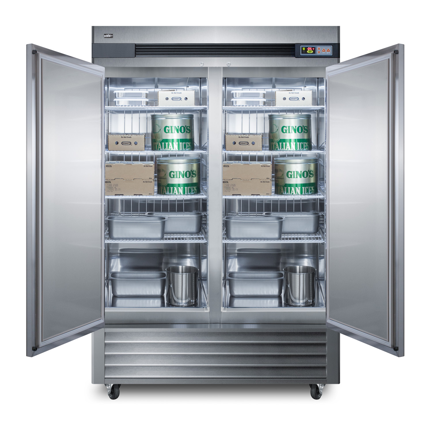 Summit Commercial's line of reach-in refrigeration features durable construction built to NSF-7 commercial standards.Made in South Korea, the SCFF497 is a two-door commercial all-freezer with a complete stainless steel cabinet. The stainless steel doors feature a self-closing design to help protect stored contents in busy commercial settings where customers may not take the time to make sure the doors are closed. They will remain open when pushed to 90º, making it easier to load and unload the unit. The sealed back design helps to simplify cleanup. This unit features a factory-installed lock located towards the top of the door for convenient security. We include a set of locking casters for optional installation.The SCFF497 features a large 49 cu.ft. interior constructed from stainless steel for easy cleanup and lasting durability. The cantilevered shelving system allows you to adjust the four vinyl-coated shelves to virtually any position, making it easy to accommodate any sized item. This unit is designed to fit common commercial baking trays. The LED lighting offers an energy efficient display when the door is opened. This unit utilizes adjustable cycle defrost operation to avoid temperature spikes, with a top-mounted forced air cooling system to ensure rapid temperature recovery.To ensure optimum storage conditions, the SCFF497 is equipped with a microprocessor temperature controller that makes it easy for staff to adjust the temperature. The large digital LED readout displays the current and high/low temperatures in Celsius or Fahrenheit. An audible and visual temperature alarm sounds if the unit rises or falls above a user-set range. Additional alarms include a power failure alert, door open alarm, and a condenser cleaning reminder. Designed with hydrocarbon refrigerant, the SCFF497 provides an energy efficient solution to large capacity storage. It is ETL-S listed to NSF-7 commercial standards. For a matching refrigerator, see the SCRR492.
