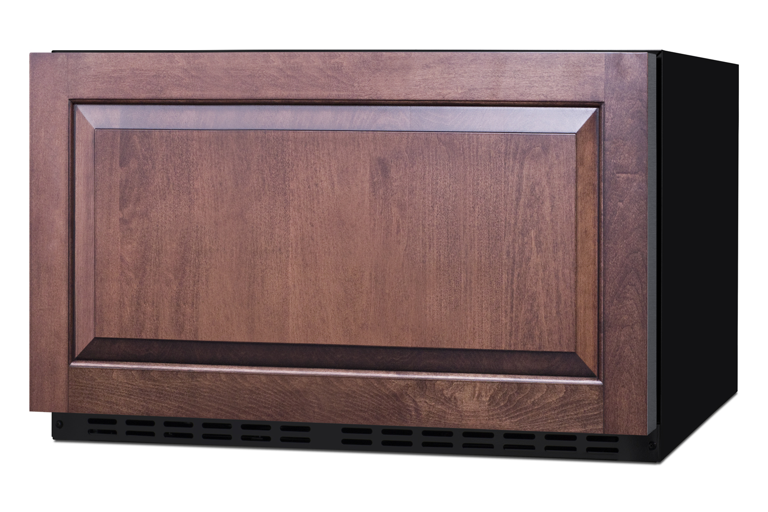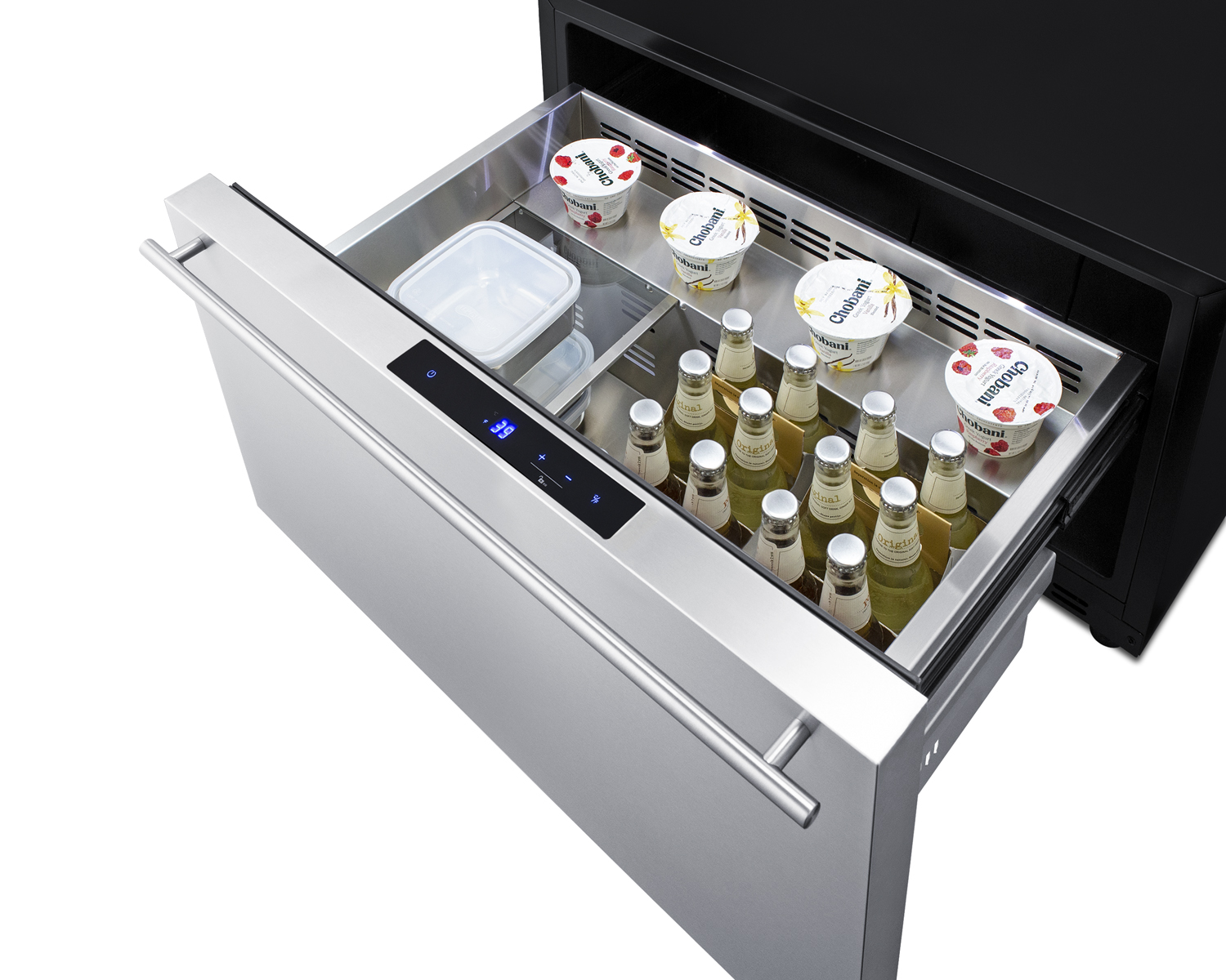 Summit offers a quality line of commercially approved drawer refrigerators, including single drawer options for built-in installation.The SDR30 is a single drawer all-refrigerator that meets NSF-7 and UL-471 commercial standards and is also approved for residential settings. It's sized at just under 30" wide for an easy fit in standard cutouts, with a front-breathing design that allows built-in installation. The fully finished black cabinet also enables freestanding use. The drawer features 304 grade stainless steel construction inside and out, with a fully finished front that can also be customized with your own overlay panel (not included) to match existing cabinetry style (panel dimensions: 15.6" H x 29.5" W at 3/4" maximum thickness). This unit has a sealed rear with no exposed coils and a right angle plug for an easier fit.Inside, the SDR30 has a 2.5 cu.ft. capacity to accommodate your storage needs. Frost-free operation with fan-forced cooling ensures even temperature distribution with minimal user maintenance. A digital thermostat, located atop the refrigerator drawer, makes it easy to manage the temperature, with an LED display that can be read in Celsius or Fahrenheit. Two removable dividers let you separate the drawer into one, two, or three zones to accommodate a variety of sizes. We also include a half-sized glass shelf. LED lighting affords a convenient view of store contents, while a child lock will disable the digital controls after two minutes of inactivity to prevent accidental adjustments. Additional features include audible alarms for high-temperature fluctuations and open drawer alerts, while a temporary memory function helps to recover all settings in the event of power loss. The Sabbath Mode setting disables certain electrical features during periods of religious observance.With its fully-featured, weatherproof design, the SDR30 is the perfect cooling compartment or beverage holder for home kitchens, as well as hotel spaces, foodservice areas,