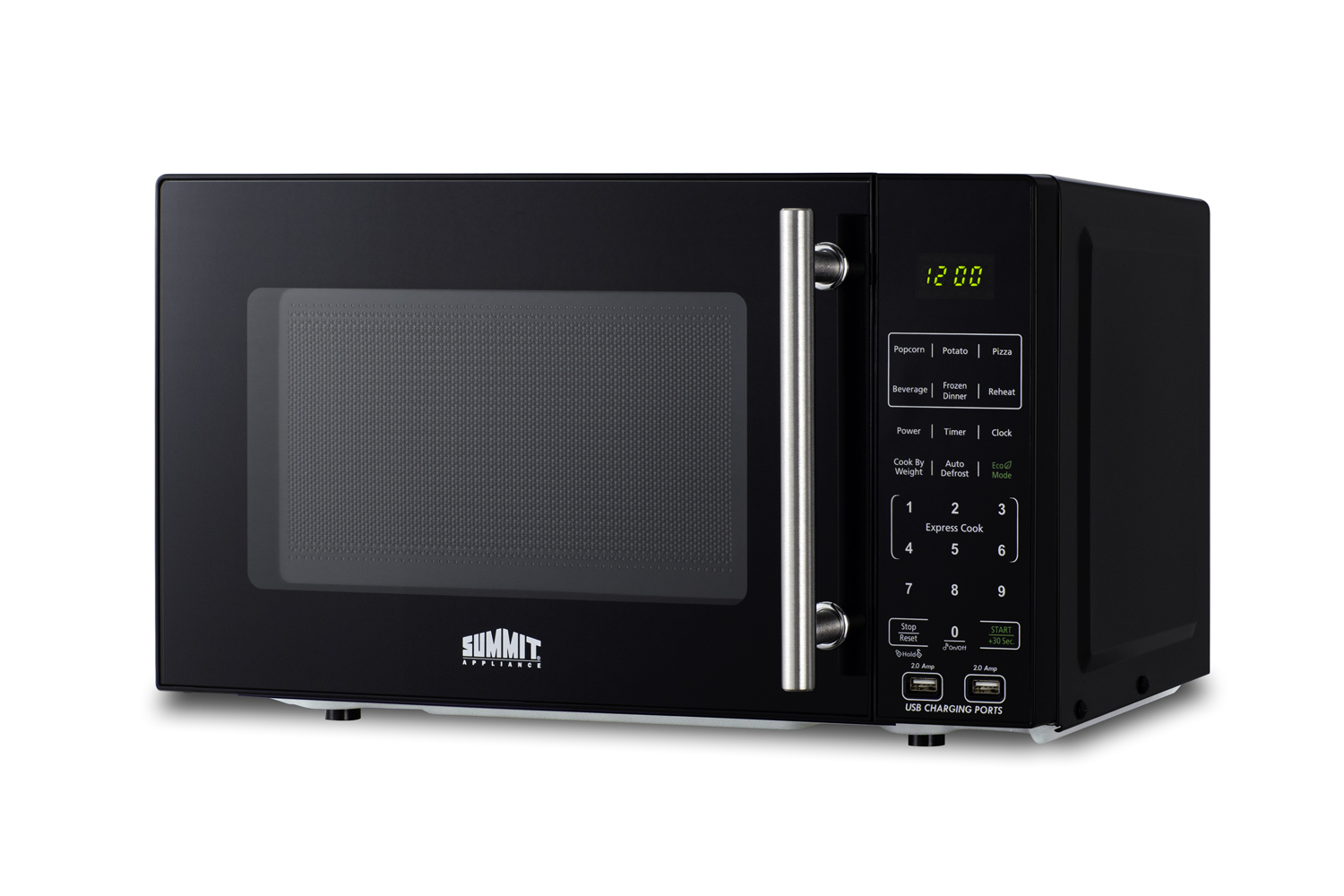 Summit's selection of microwave ovens includes fully featured models specially designed to maximize convenience in residential and hospitality settings.Model SM903BSA1 is a countertop microwave in a jet black finish, with a door window for convenient viewing and an easy-grab handle in brushed stainless steel. The rear features a built-in allocator that accepts a 2 or 3-prong plug, making this unit ideal for 1-cord use with a refrigerator, coffeemaker, or other appliance. The allocator automatically disables the second appliance when the microwave is in use, resuming power after the cycle is finished in order to prevent power surges. Two USB ports are built into the front to allow for charging of mobile devices. The digital control panel features one-touch settings for pizza, potatoes, popcorn beverages, frozen dinners, and reheating. Additional settings let you auto defrost, cook by weight, or add 30 seconds for fast reheating. Multi-stage cooking lets you combine different functions. The digital display can be disabled in eco mode and the end-of-cycle alerts muted at the touch of a button. This microwave features a clean white interior with a removable glass turntable.With its compact size and innovative power-saving design, the SM903BSA1 offers convenient benefits for a variety of locations.