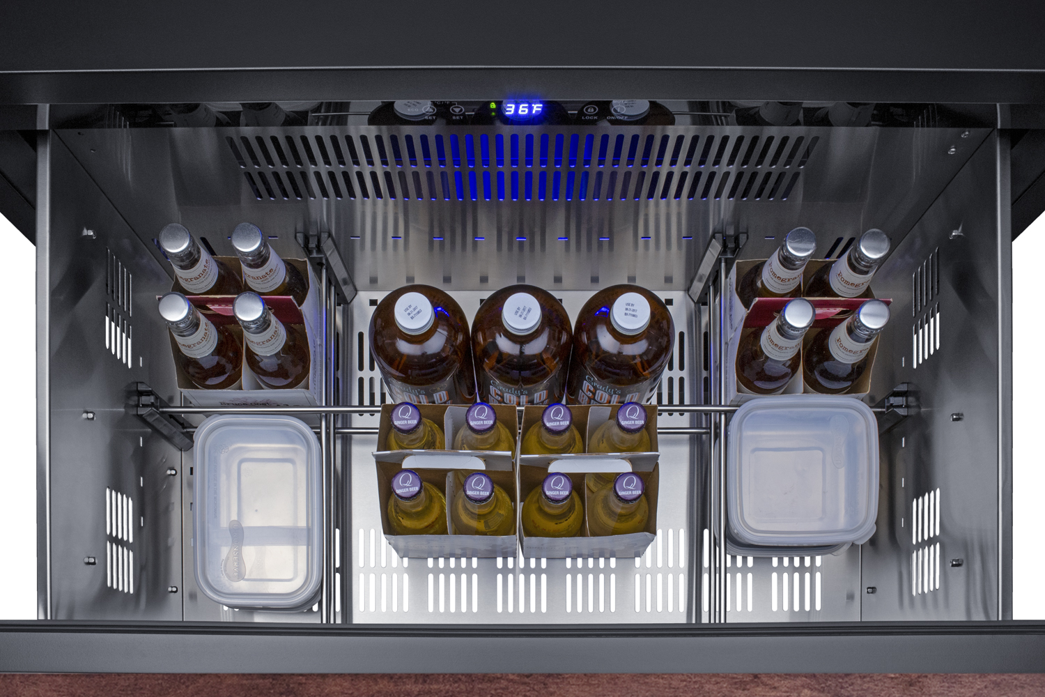 Summit is expanding its popular lineup of built-in undercounter drawer refrigeration with a new luxury 36" wide unit for residential or commercial kitchen spaces. The SPR36332DPNR is a 2-drawer all-refrigerator sized just under 36" wide and 24" deep for an easy fit under the counter in indoor or outdoor kitchens. The stainless steel drawer fronts can be easily removed to accept full overlay panels for a custom look to match or complement any kitchen style. We include a set of designer handles for optional use. This unit has a front-breathing design for built-in installation, with a fully finished cabinet to also allow freestanding use. The unit's sealed back and right-angle plug help to ensure an easy fit. With a generous 7.15 cu.ft. interior capacity, the SPR36332DPNR is perfect for keeping various items in easy reach. Each stainless steel drawer includes a set of removable divider that lets you create six adjustable sections inside to help organize the interior. The intuitive digital control panel features a wide temperature range, allowing you to adjust your storage conditions for standard food items or beverages better held at warmer temperatures. The temperature display can be switched from Fahrenheit to Celsius for added convenience. The SPR36332DPNR operates with a frost-free system, which minimizes the need for manual defrosting and reduces maintenance. Internal fans help to maintain an evenly cooled interior, ensuring that your items are kept at the desired temperature. Additional features include open drawer alarms, a child lock to prevent changes to the controls, an eco mode setting, and a 96 hour sabbath mode to disable certain features for periods of observance. Both drawers feature LED lighting in a striking blue finish for elegant illumination.The SPR36332DPNR features weatherproof construction for safe installation in outdoor kitchens. It is ETL-S listed to NSF-7 commercial standards and also complies with residential regulations for home use. In add