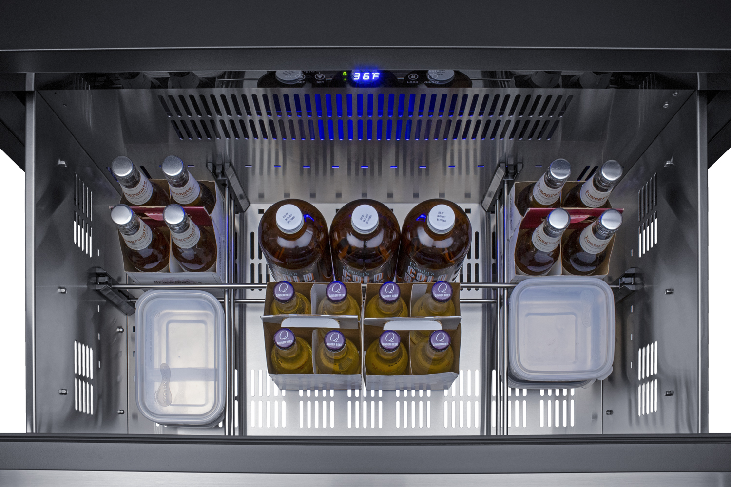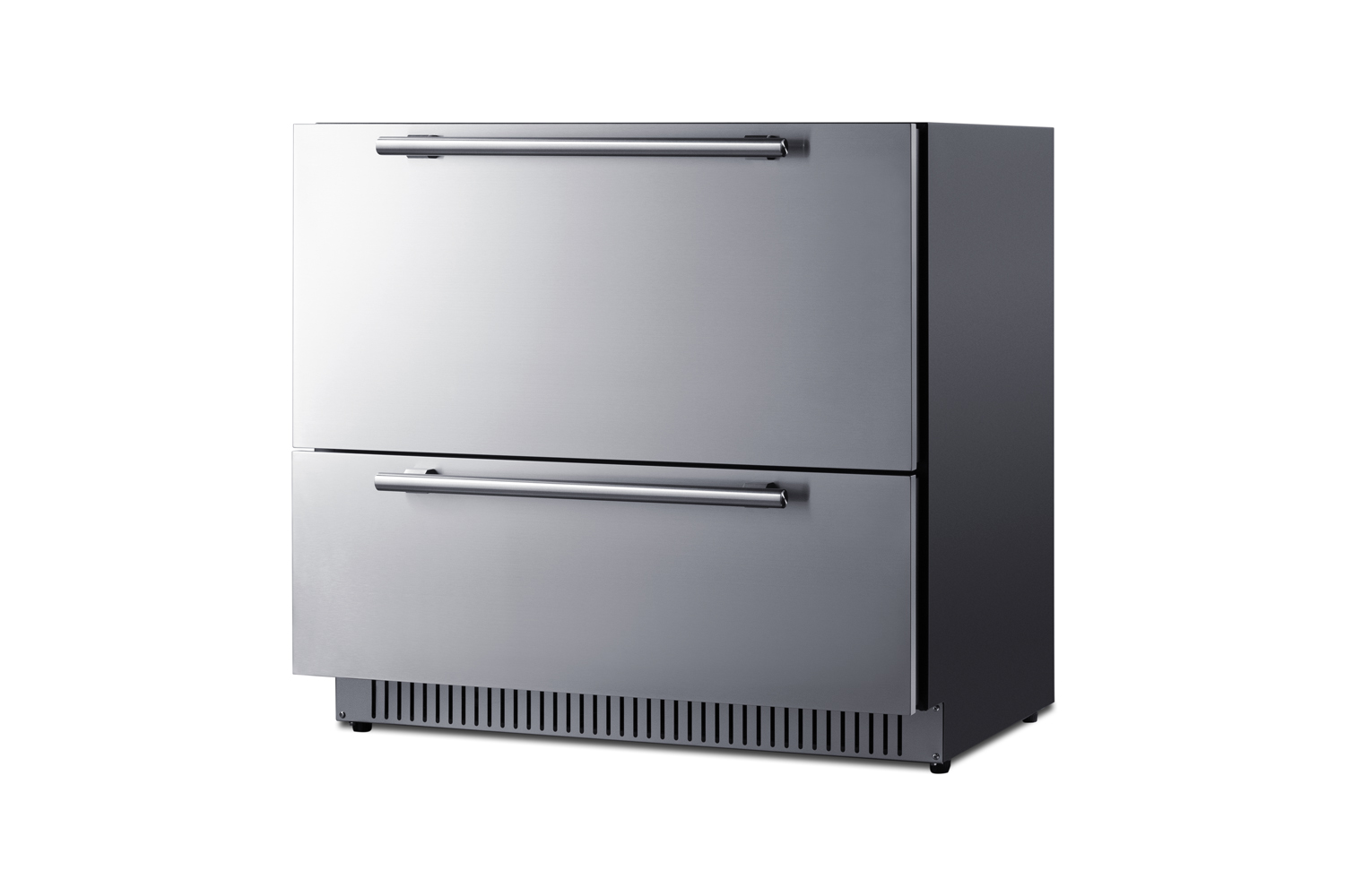 Summit manufactures an extensive selection of built-in refrigeration specially constructed for safe and reliable cooling in outdoor kitchens, including new 36" wide drawer refrigerators approved for residential or commercial spaces.The SPR36DROS is a 2-drawer all-refrigerator sized just under 36" wide and 24" deep for an easy fit under the counter in any outdoor kitchen. Stainless steel drawers paired with professional stainless steel handles ensures lasting durability and a stunning, contemporary style to suit any setting. The fully finished drawer fronts can also be removed to accept full overlay panels for a custom look to match any kitchen style. The front-breathing design allows built-in installation, while the fully finished black cabinet enables freestanding use. The unit's sealed back and right-angle plug help to ensure an easy fit. With a generous 7.15 cu.ft. interior capacity, the SPR36DROS is perfect for keeping various items in easy reach. Each drawer includes a set of removable divider that lets you create six adjustable sections inside to help organize the interior. The intuitive digital control panel features a wide temperature range, allowing you to adjust your storage conditions for standard food items or beverages better held at warmer temperatures. The temperature display can be switched from Fahrenheit to Celsius for added convenience. The SPR36DROS operates with a frost-free system, which minimizes the need for manual defrosting and reduces maintenance. Internal fans help to maintain an evenly cooled interior, ensuring that your items are kept at the desired temperature. Additional features include open drawer alarms, a child lock to prevent changes to the controls, an eco mode setting, and a 96 hour sabbath mode to disable certain features for periods of observance. Both drawers feature LED lighting in a striking blue finish for elegant illumination.The SPR36DROS features weatherproof construction for safe installation in outdoor kitchens. It i