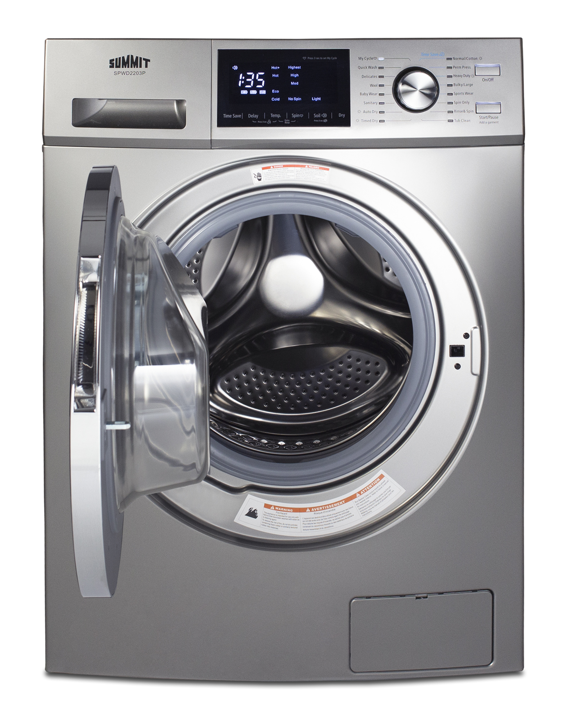 SUMMIT SPWD2203P is a 24" wide washer/dryer combo designed to maximize laundry capacity in an easy fit.This non-vented condensing (ductless) 115V washer/dryer comes in a modern platinum finish. The stainless steel drum offers a generous 2.7 cu.ft. capacity to accommodate larger laundry loads than previous versions of this unit. The front-loading design features a large, easy-to-open glass door and pull-out dispenser for detergent and fabric softener. A combination digital and dial control panel with a large LCD readout makes it easy and intuitive to operate this unit.The SPWD2203P includes 16 wash programs to ensure all fabrics receive the proper treatment. Settings include specialized programs for cotton, permanent press with de-wrinkling, heavy duty, bulky/large loads, sportswear, babywear, wool, delicates, and more.A "Sanitize" cycle allows the washer to use higher temperatures for smaller loads, while a "Quick" setting is ideal for washing small loads in less time. For improved maintenance, this combo includes a "tub clean" cycle. Five spin speeds up to 1300 RPM help to provide the right level of spin for each dry cycle. This unit offers the choice of four temperature settings and three soil levels, as well as a memory function ("My Cycle") for added convenience.With its quality performance, large capacity, and attractive design, the SPWD2203P brings true value and efficiency to laundry in space-challenged settings.NOTE: This unit replaces previous model SPWD2201SS, and features an upgraded interior with a larger wash and dry capacity.
