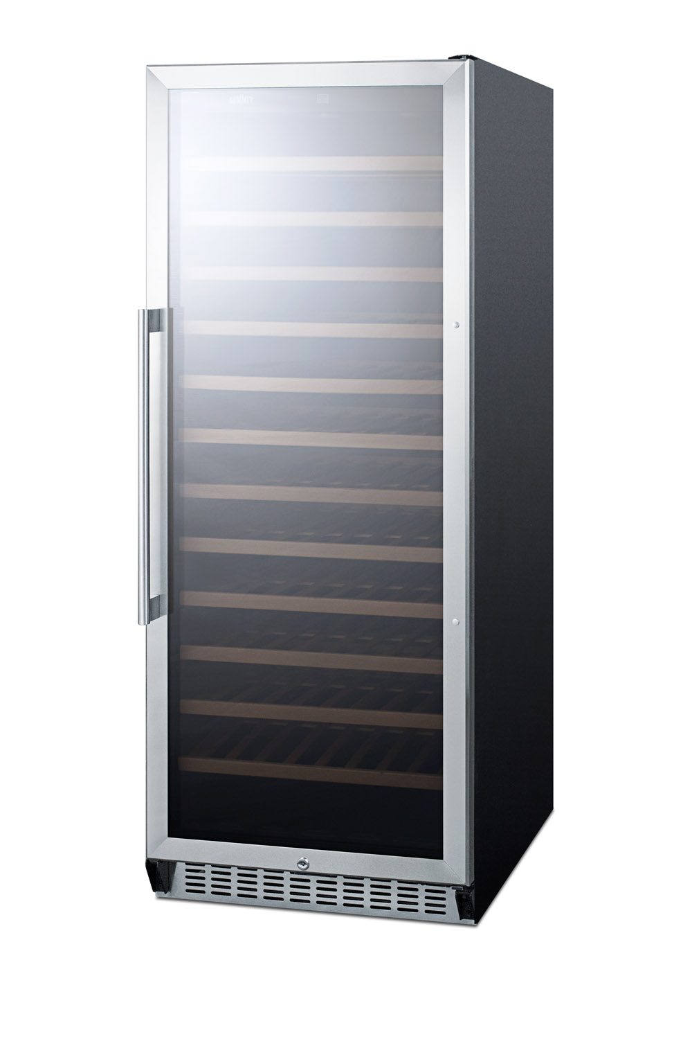 SUMMIT SWC1102 is a mid-sized wine cellar with a deluxe design for optimum storage.The SWC1102 features twelve slide-out wooden shelves that can store up to 102 of the standard 750ml Bordeaux bottles or larger diameter Pinot Noir/Chardonnay style bottles (for details, see our Racking System Guide in this product's image gallery). The single-zone interior features recessed LED lighting for an attractive presentation. A digital thermostat ensures easy and precise temperature management.With a front-breathing design and fully finished cabinet, the SWC1102 can be used either built-in or freestanding. It features a jet black cabinet and stainless steel trimmed reversible glass door. A sleek handle and stainless steel kickplate complete the professional look. This unit includes a factory installed lock for added security for your collection.