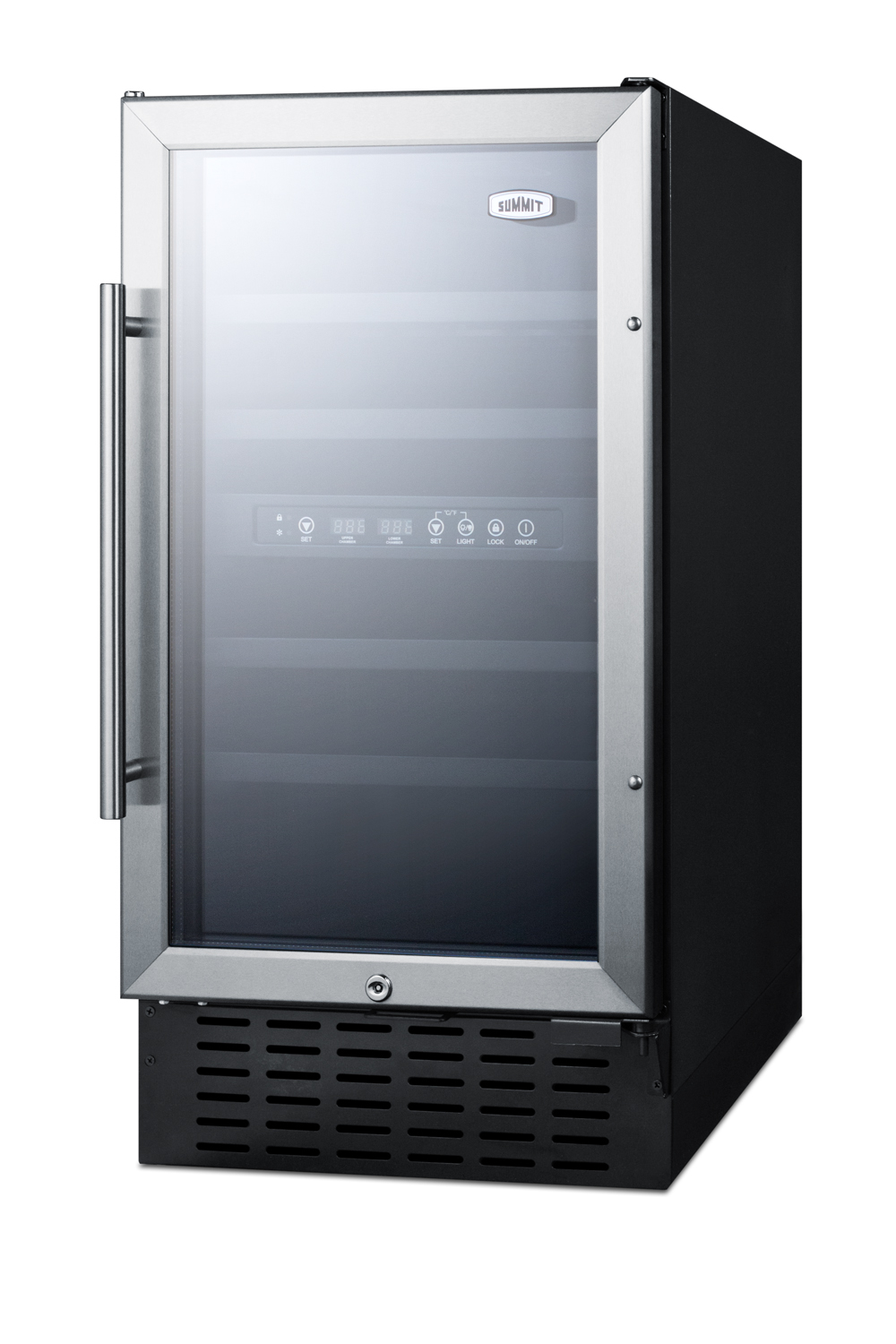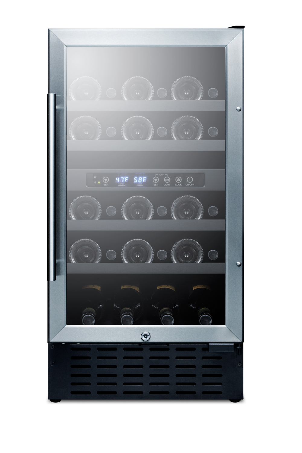 SUMMIT's collection of built-in wine cellars offers fully featured choices in slim fits, allowing smaller kitchens to bring convenient and reliable wine storage for every undercounter space.Sized just under 18" wide, the SWC182Z is front-breathing for built-in installation under counters, while the fully finished black cabinet also allows freestanding use. The reversible glass door features an elegant stainless steel trim and professional handle. A factory installed lock offers added security, with two keys included.Two separate zones allow you to store your reds and whites at their own temperature, ensuring each bottle is kept under the proper conditions. This unit can hold up to 28 standard Bordeaux style bottles or 22 wider Burgundy style bottles. The wooden shelves feature a black finish for a modern look, with recessed LED lighting to provide an attractive and efficient presentation. The digital controls are located in the center for easy temperature management.With its slim fit and convenient design, the SWC182Z makes an attractive addition to any room. For this unit in a 32" ADA compliant height, see the SWC182ZADA.