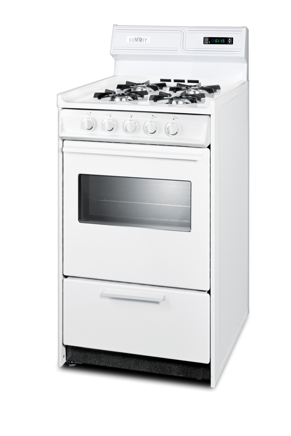 Summit Appliance offers a wide selection of American-made household ranges built for long-lasting durability in space-challenged kitchens. The WNM1307KW is an apartment-sized gas range sized at just 20" wide, with a generous 2.46 cu.ft oven interior that can accommodate large trays. Two adjustable oven racks are included. An oven window and on/off interior light allow you to easily keep watch over your cooking. The broiler is located below the oven in a drop-down compartment. Four open 9000 BTU gas burners accommodate most of your stovetop heating needs, with upfront push-to-turn knobs that let you adjust your cooking without reaching over hot burners. This unit utilizes an electronic ignition system for added safety.The WNM1307KW comes in a classic white finish, with a high backguard that includes a digital clock and timer. This unit has a recessed oven door and is conveniently sized at just 24" deep for a better fit in galley in L-shaped kitchens, where every inch counts. Constructed from porcelain and steel, the WNM1307KW offers lasting durability. We include an anti-tip bracket for added safety. With its classic style and quality construction, Summit's made in the USA cooking line offers reliable cooking for smaller homes. Additional choices are available in 24", 30", and 36" wide fits. This unit ships ready for natural gas connections. To use with propane, add the Kit LP.