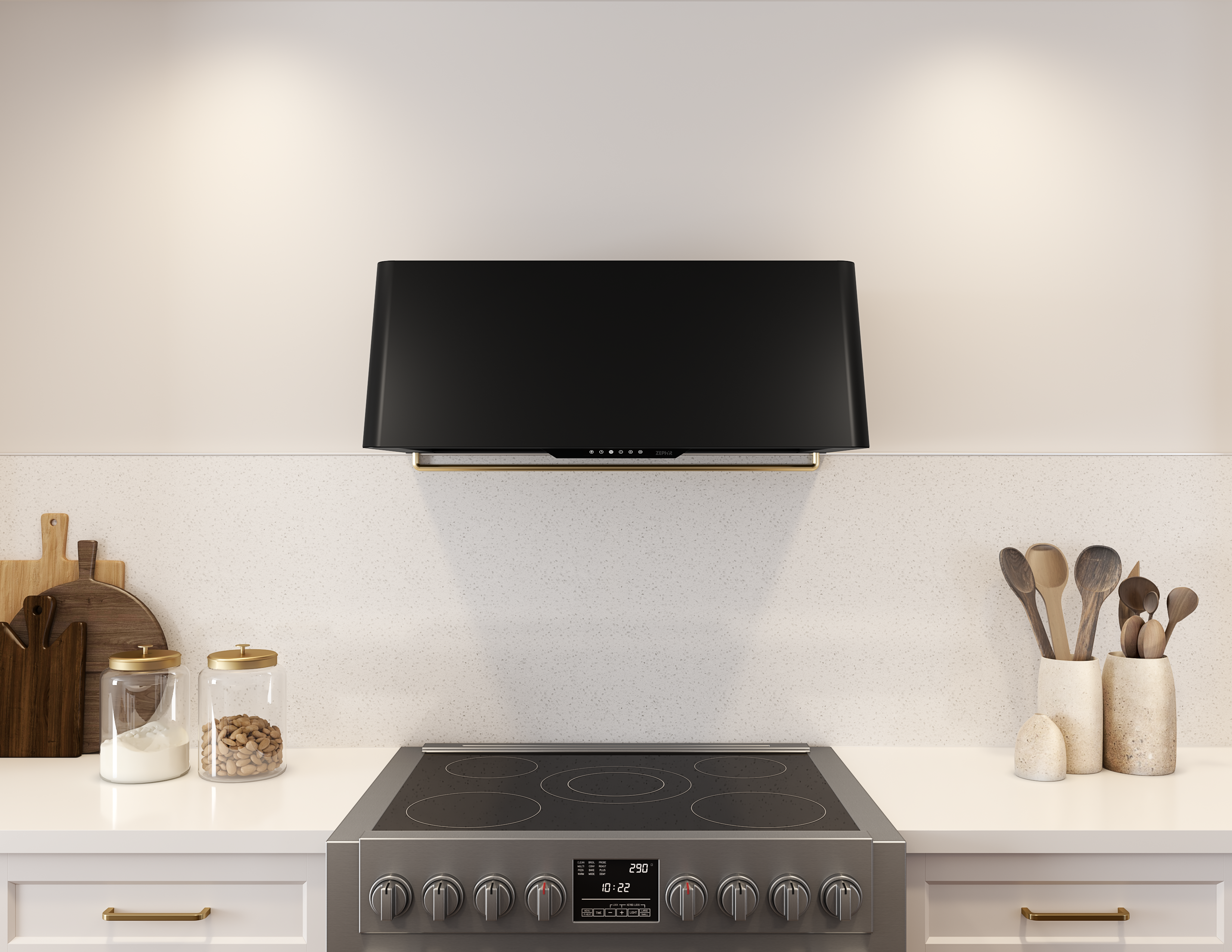Taking kitchen glamour to new heights, the Mesa Wall hood is available in three high-style finishes: satin gold, matte black, and stainless steel, for the very latest in kitchen design trends. With Invisible Touch Controls, hybrid baffle filters and multiple blower options, the Mesa is set to become the hardworking star of the most fashionable kitchens. Optional accessories include an accent rail and duct cover in satin gold, matte black, or stainless steel, and a wireless remote control.