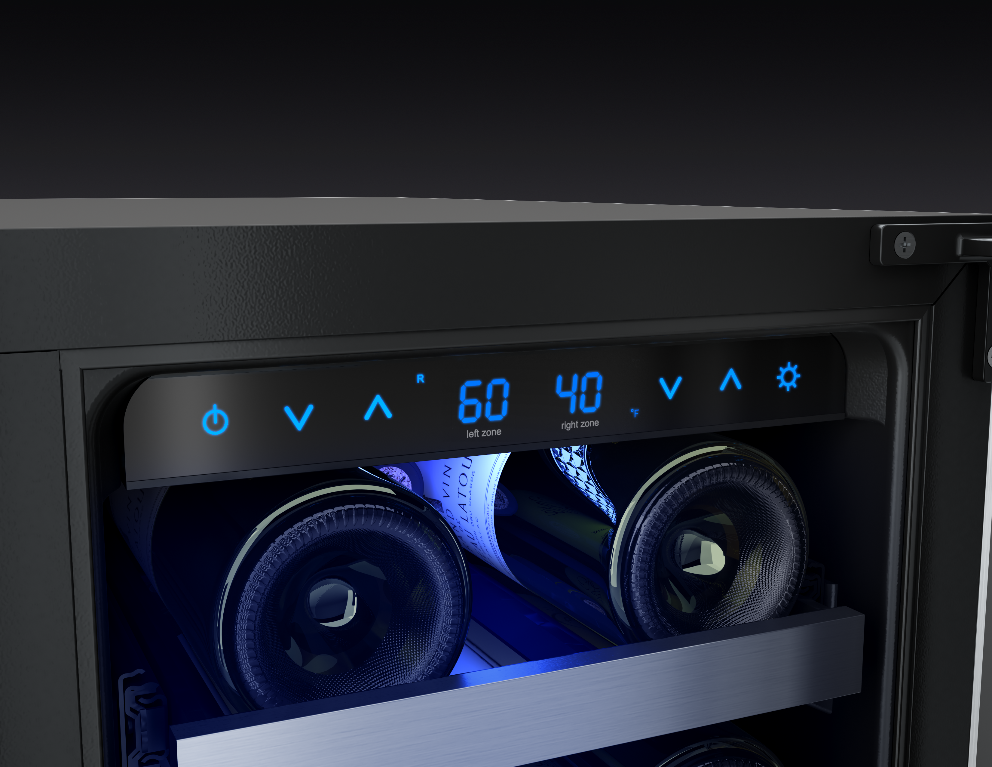 The Presrv French Door Wine Cooler is the ultimate in sophisticated home beverage service, ready for dinner parties, happy hours, and more. This large capacity cooler maintains two distinct temperature zones with PreciseTemp temperature control, Active Cooling Technology and loads of other features from an updated kickplate with lock to Full-Extension Wood Racks to a Vibration Dampening System and more. And now you can enhance any partys vibe with an illuminated control panel and 3-Color LED lighting in two light levels.