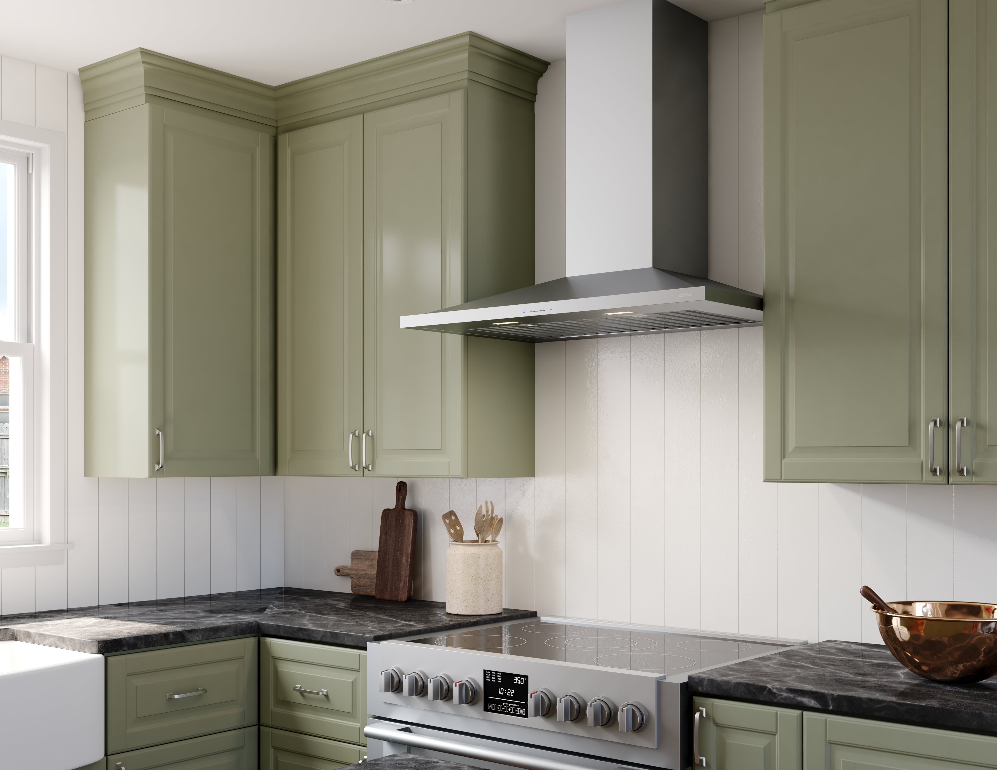 Anzio, a low-profile, chimney-style range hood that will add style and value to any kitchen. Available in stainless steel and black stainless steel finishes for improved durability and easy cleaning. Complete with a 600-CFM blower, ICON Touch controls, LumiLight LED lighting and our exclusive Airflow Control Technology (ACT). Now available with an optional ADA-compliant remote control.