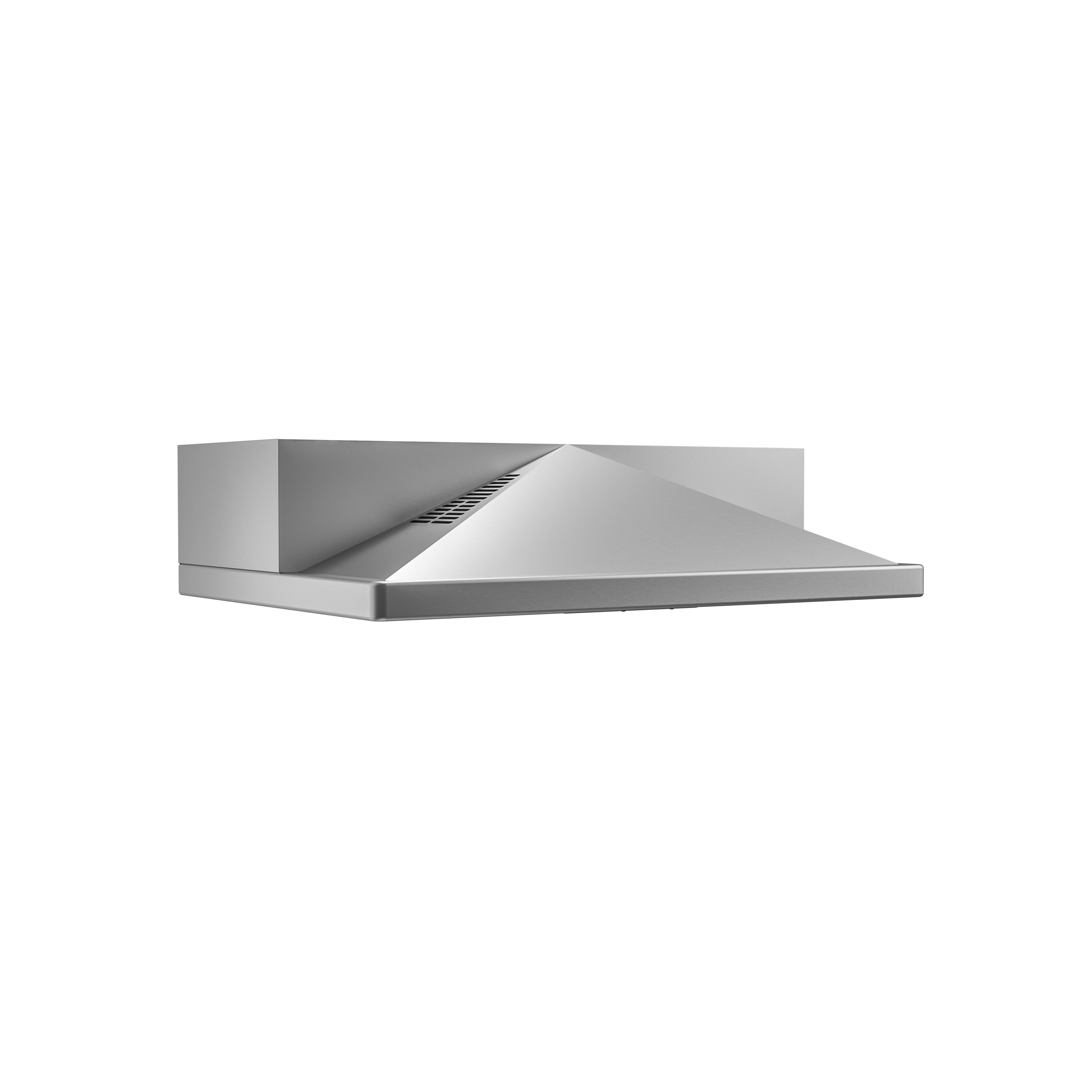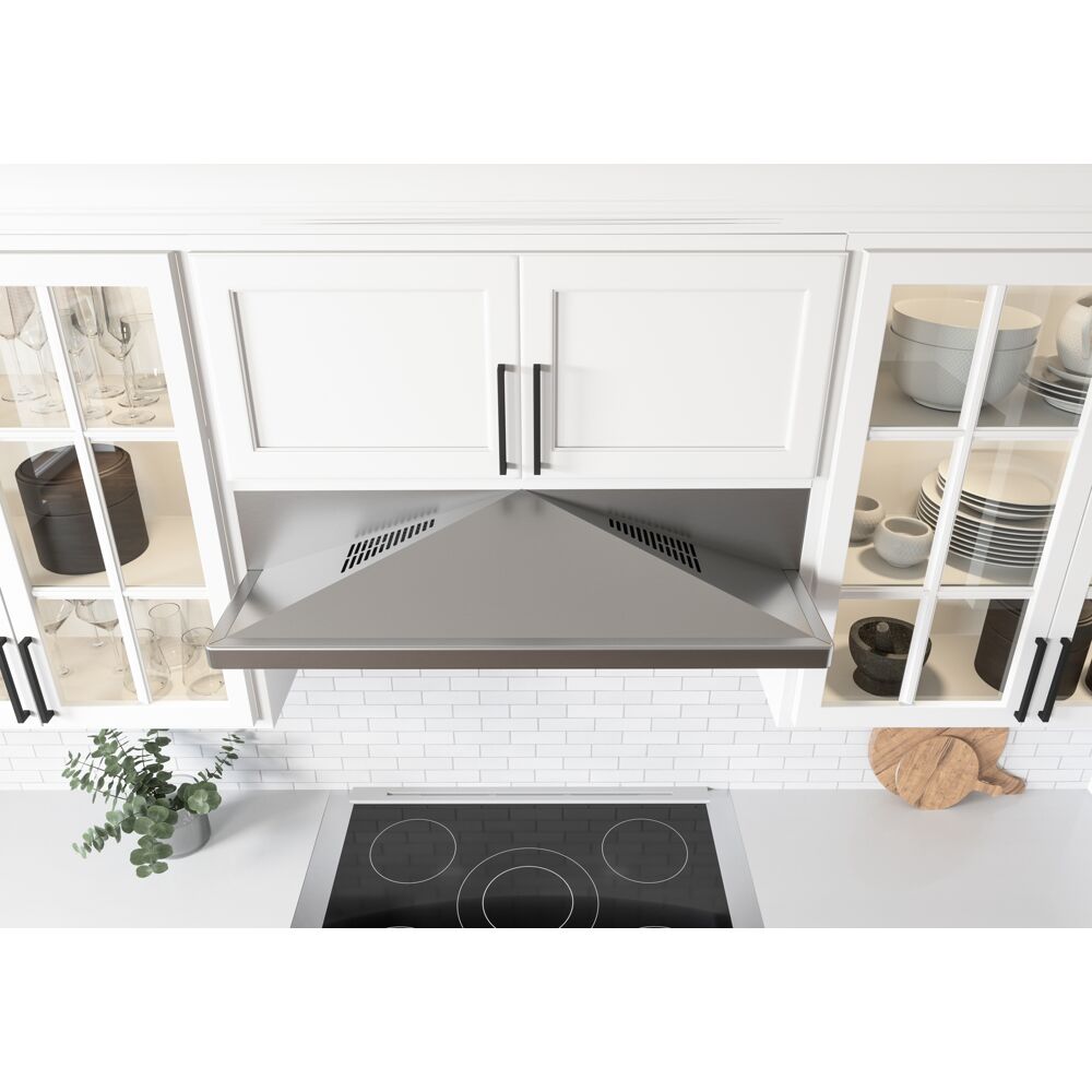 Classic, architectural lines meet at an apex to energize the familiar look of the chimney style under-cabinet hood. This expressive yet utilitarian design is upgraded with a perimeter aspiration panel (PAS) for the ultimate fusion of style and performance. Dual-level LumiLight LED lights illuminate the surface below while the 12 depth ensures simple operation and a true fit with popular cabinet styles.