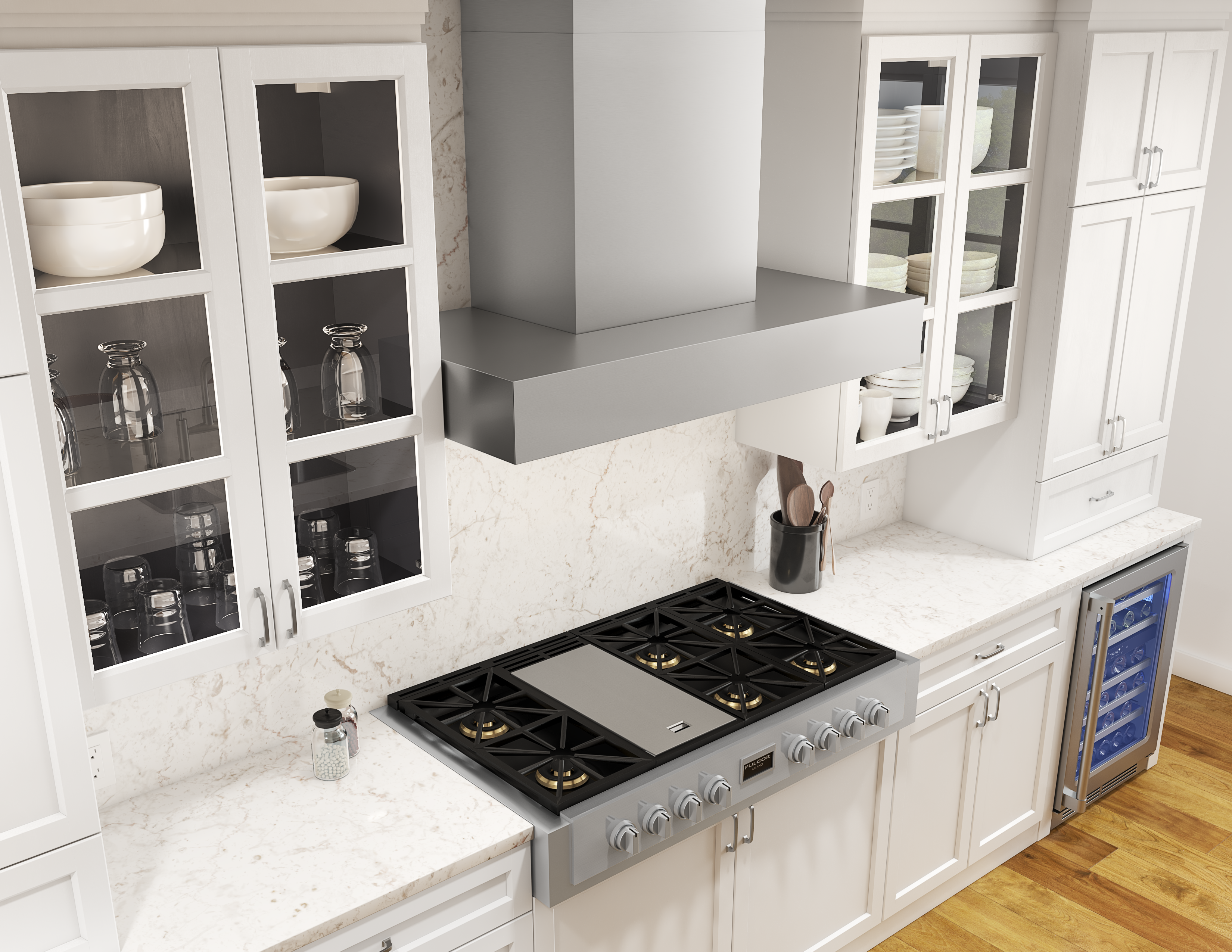 Roma Pro redefines the meaning of pro-style hood with its remarkable size, powerful blower, and contemporary shape. Featuring Zephyrs PowerWave blower technology, Roma Pro boasts a 750-CFM blower with the option to combine two blowers together to achieve 1,300 CFM. Its unique aerodynamic blades improve efficiency with unparalleled quiet operation. Roma Pro also features LumiLight LED lighting, Airflow Control Technology (ACT), and pro baffle filters.