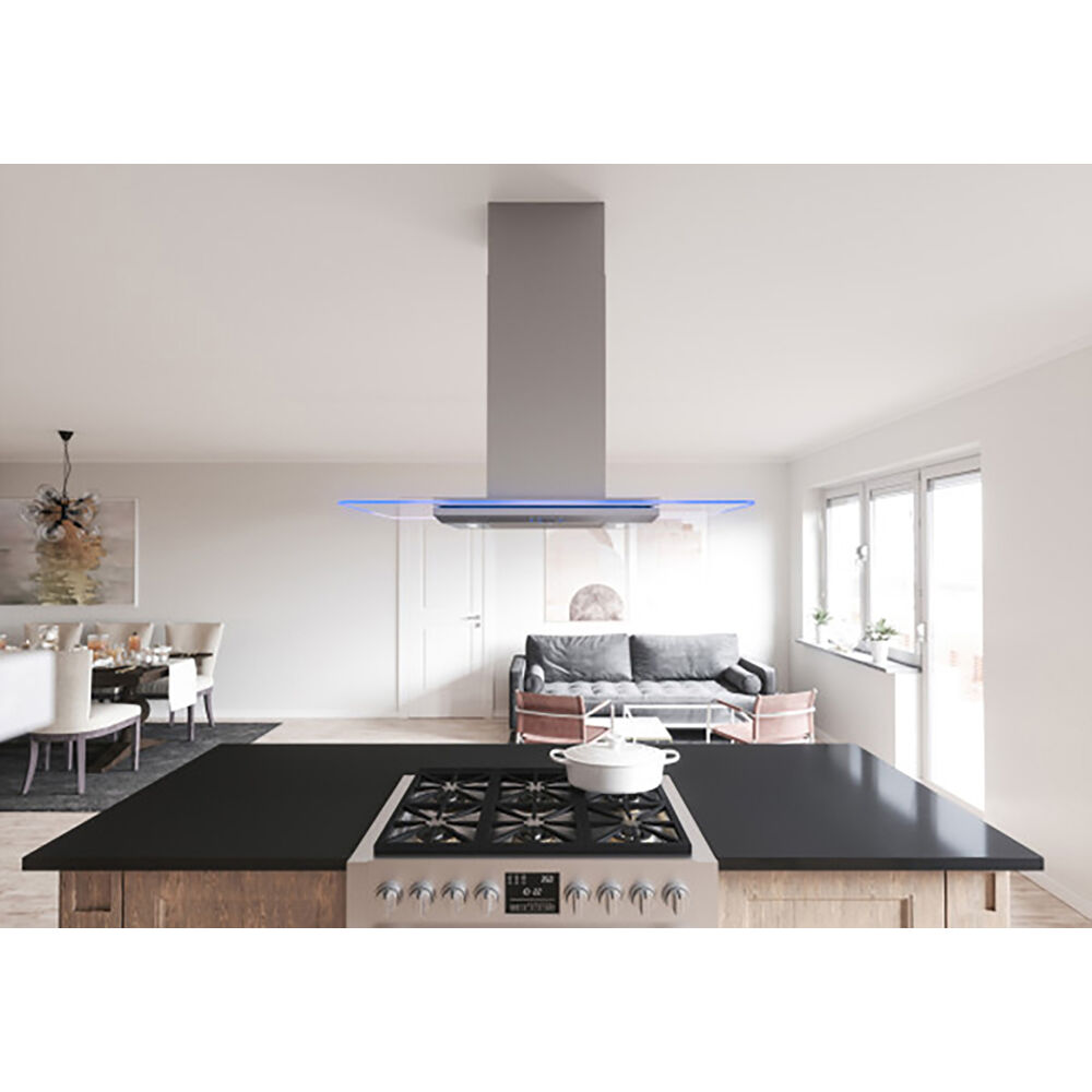 Zephyr Verona Island is topped with a straight glass canopy that also serves as an ambiance setting LED display. Select the Cloud White, Deep Blue and Amber color options to best match your kitchens décor, or choose the demo mode that displays all three settings in 10 second intervals. Verona includes the exclusive Quick Lock Installation System with magnetic duct covers, LumiLight LED lighting, 5 Speed ICON Touch controls and ACT Technology.